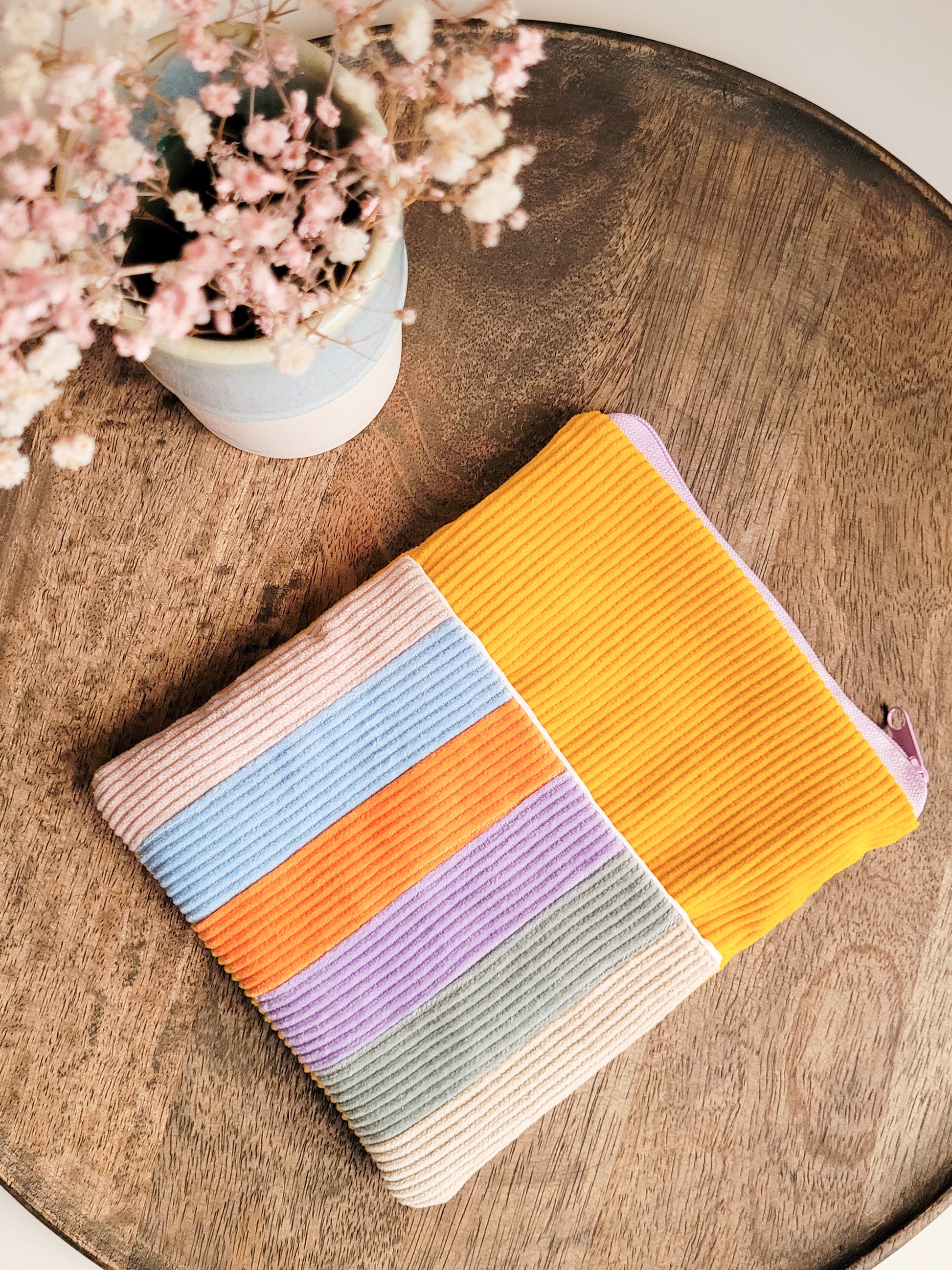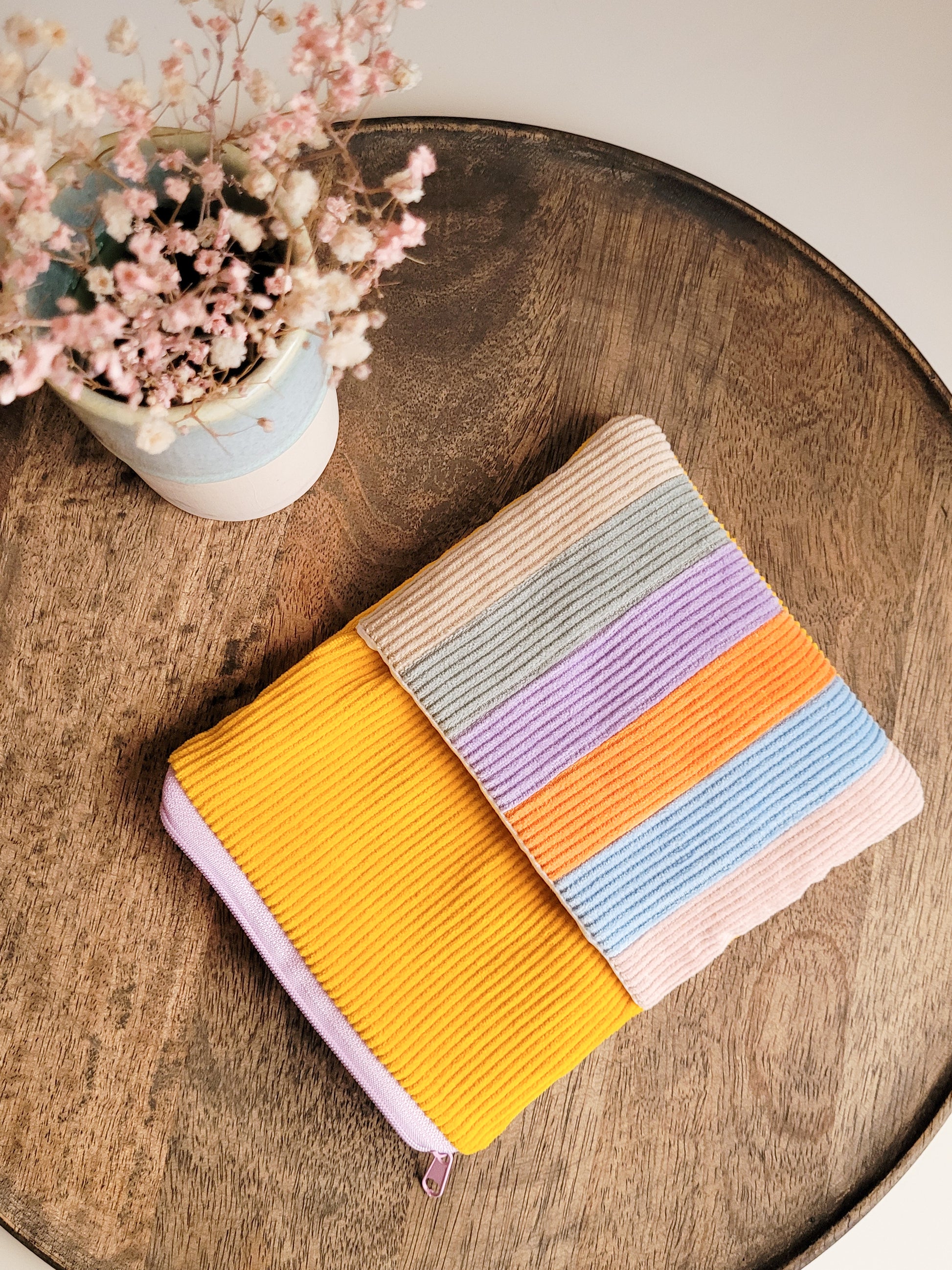 Um Deinen E-Book-Reader perfekt zu schützen, eignet sich diese gepolsterte Tasche aus robustem Cordstoff in der Farbkombination Gelb und einer bunten Vordertasche aus 6 Farben, hervorragend. Diese E-Reader Tasche kann oben mit einem Reißverschluss sicher verschlossen werden. Zusätzlich ist außen noch eine Vordertasche eingenäht um zum Beispiel Stifte, Notizblock oder auch dein Ladekabel unterzubringen.