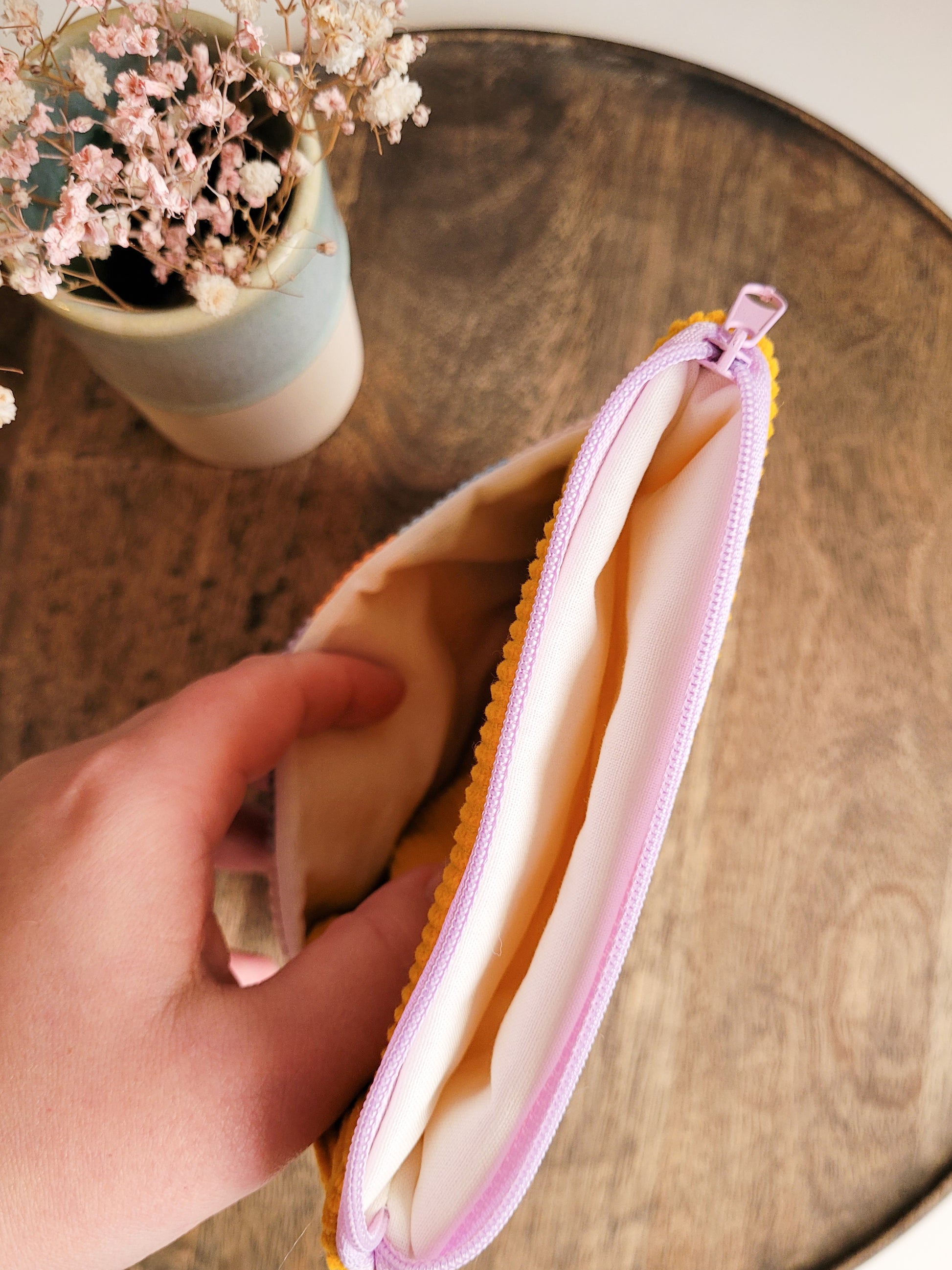 Der Reißverschluss ist in einem passenden Lavendel und oben eingenäht.