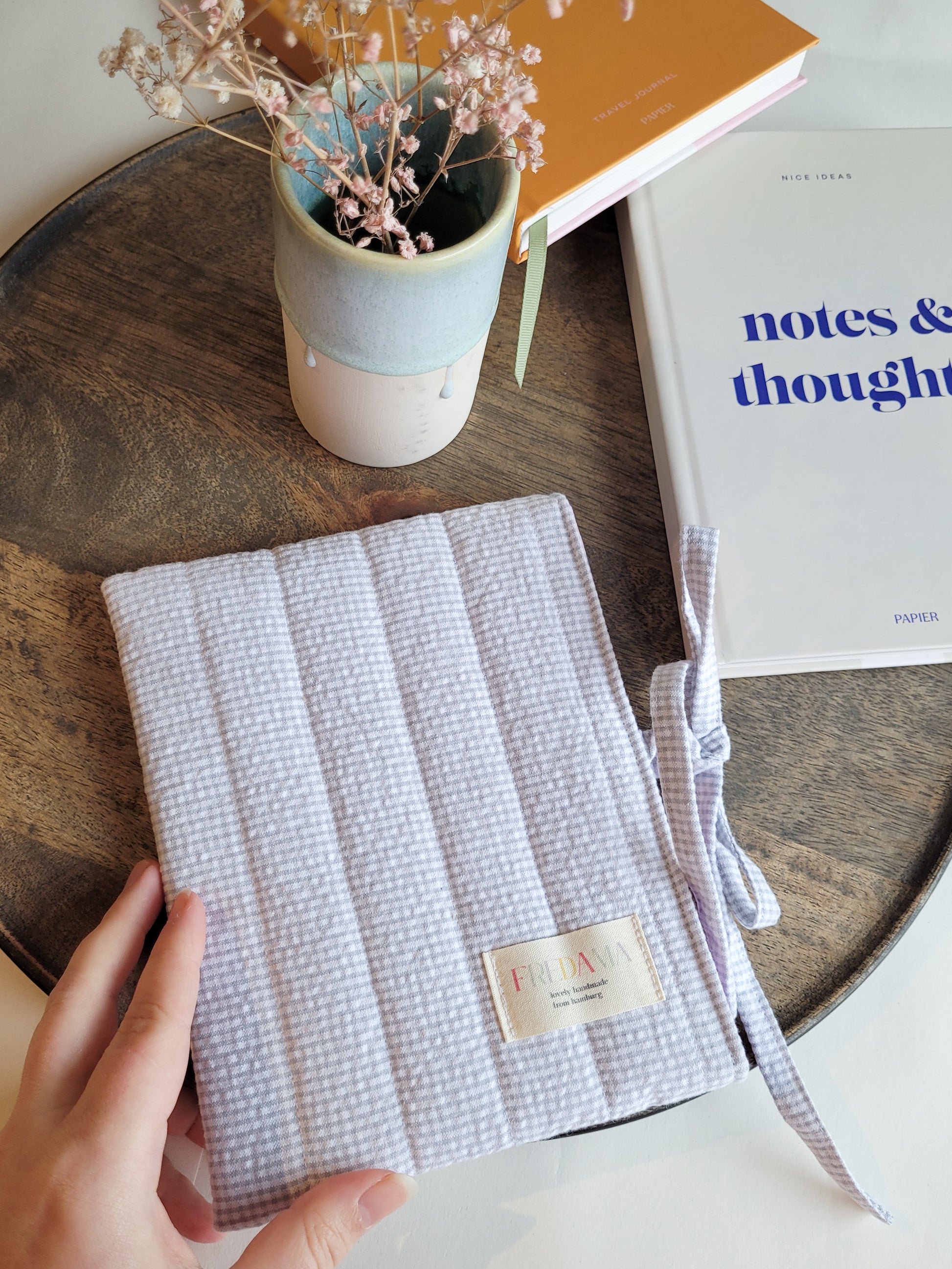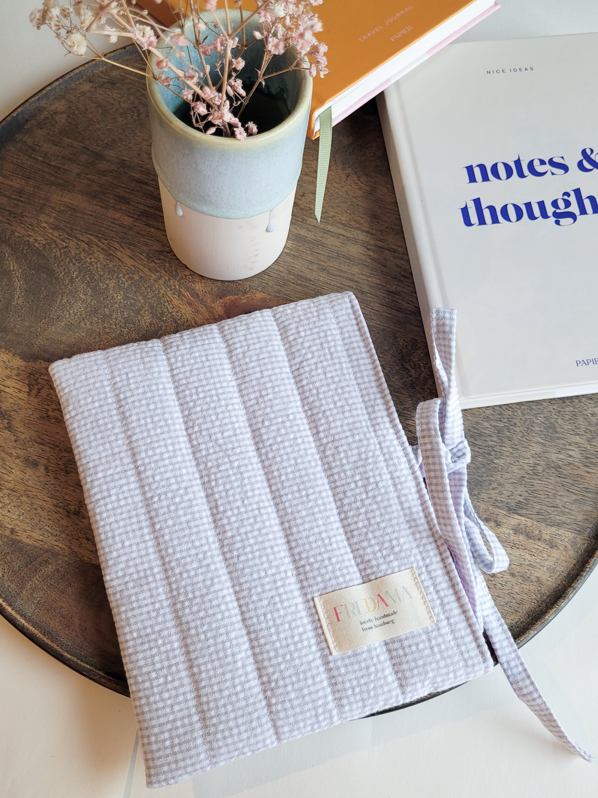 E-Reader Tasche hellgrau kariert mit Schleife zum Schließen - aus Seersucker