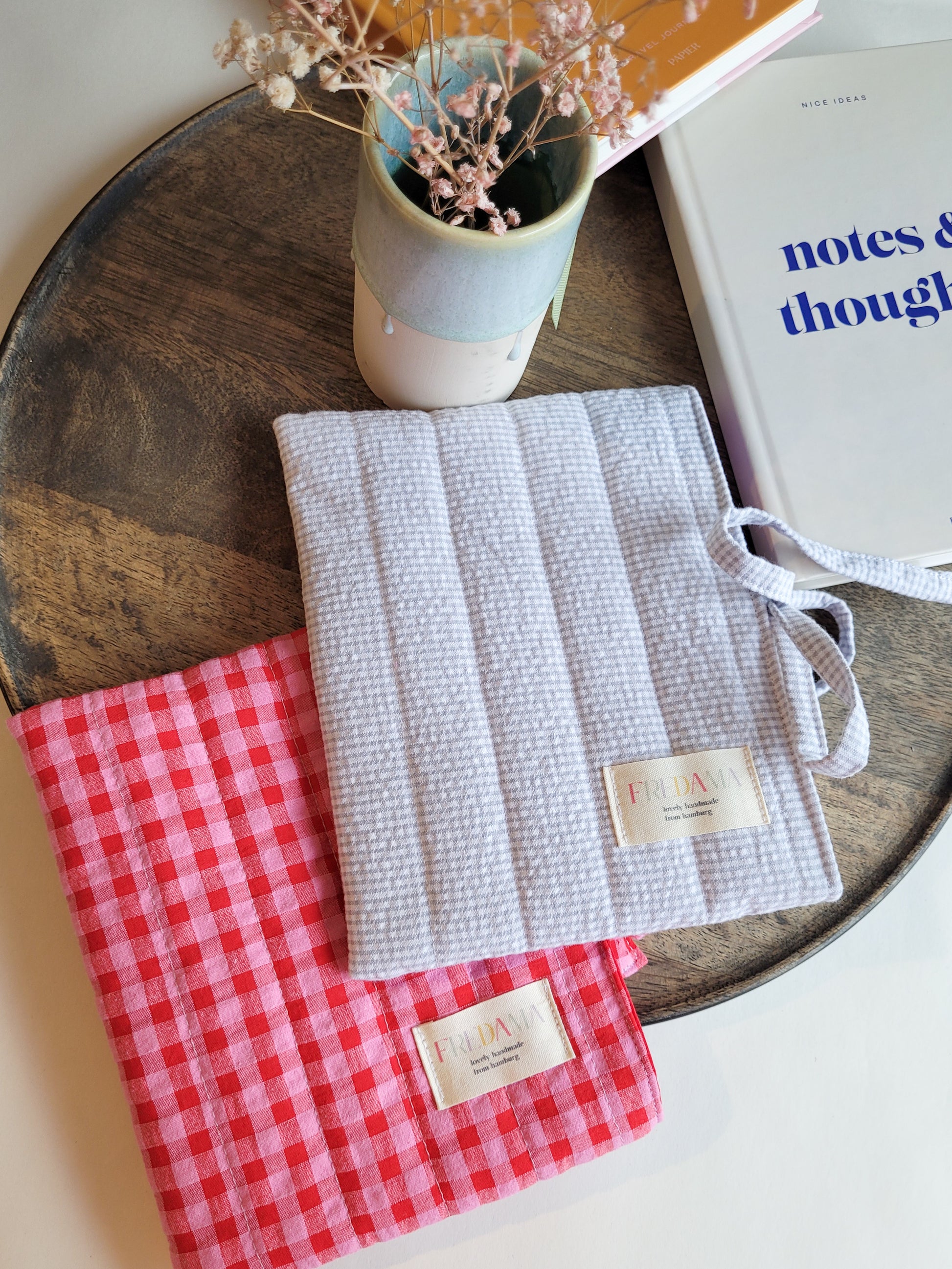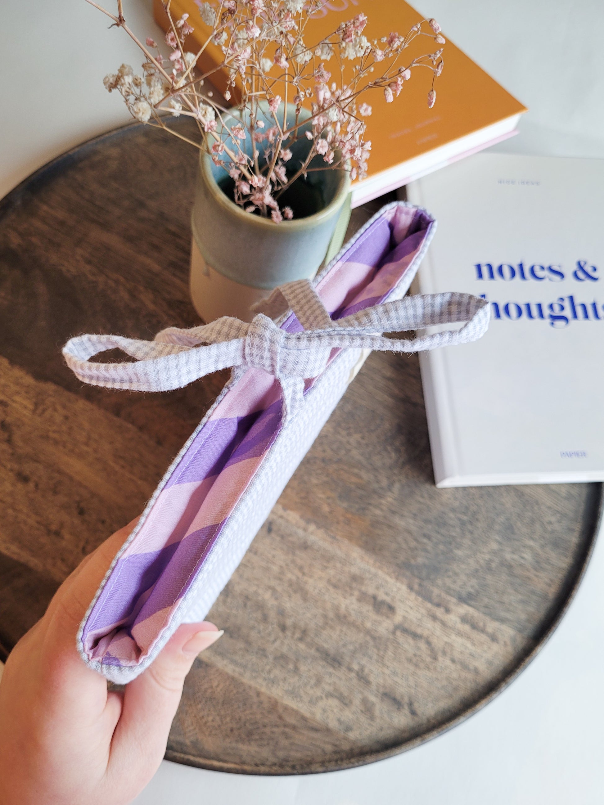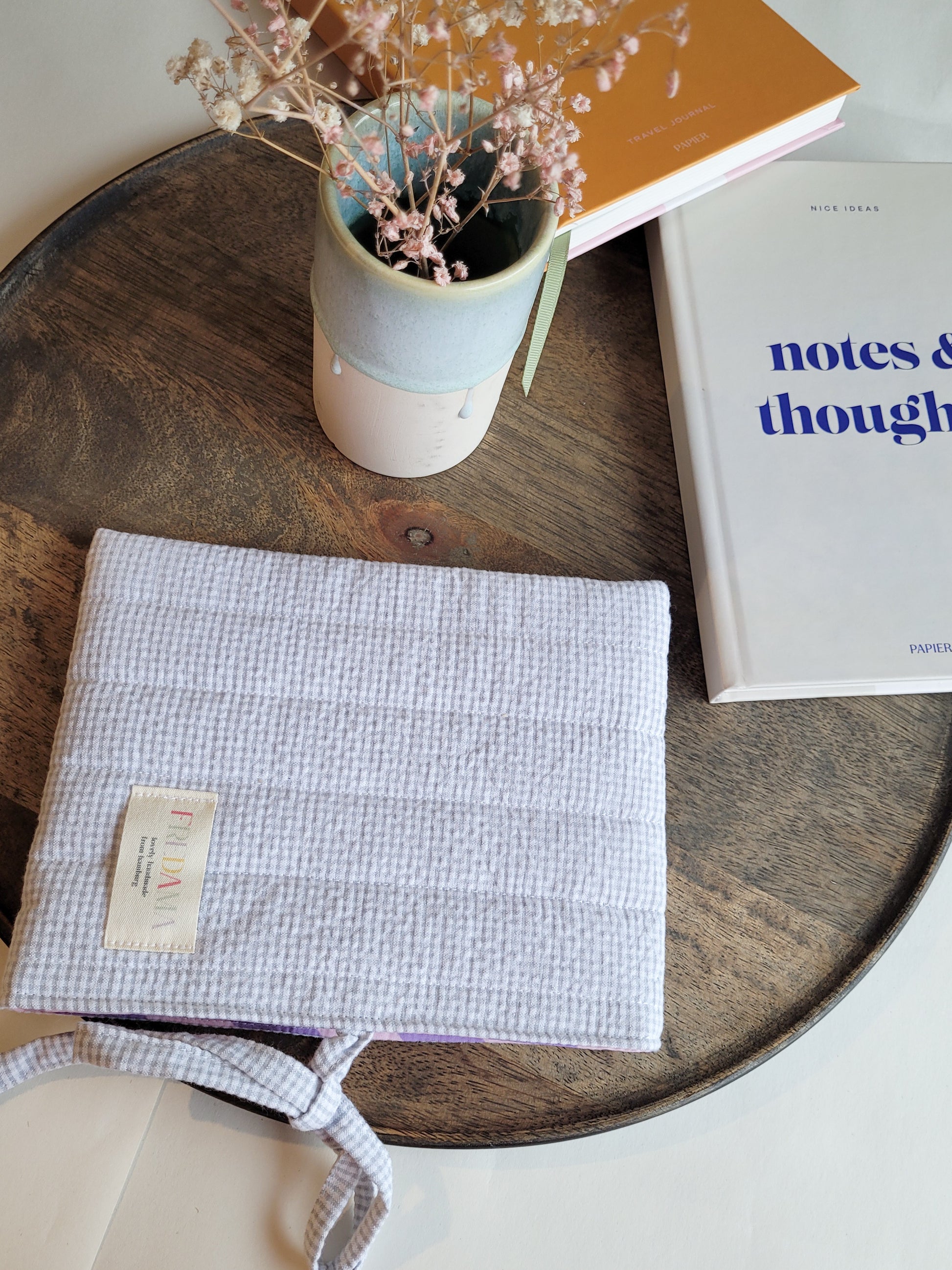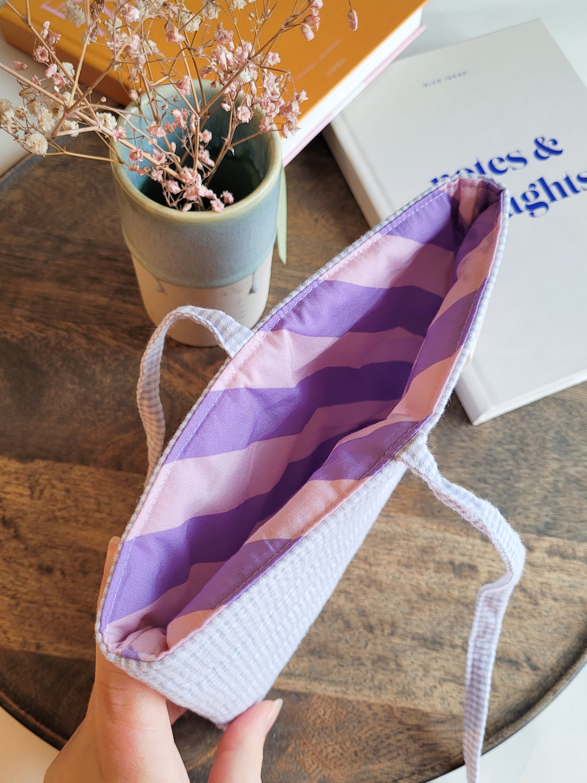 hellgrauer karierter Seersucker Stoff [130g/m2 und OEKOTEX100 zertifiziert] besteht aus 100% Baumwolle. Innen ist ein rosa/lila gestreifter 100% Baumwollstoff genutzt und eine Watteeinlage 110g/m2 eingenäht. Außen ist noch mein Logo in Form eines Labels aufgenäht.