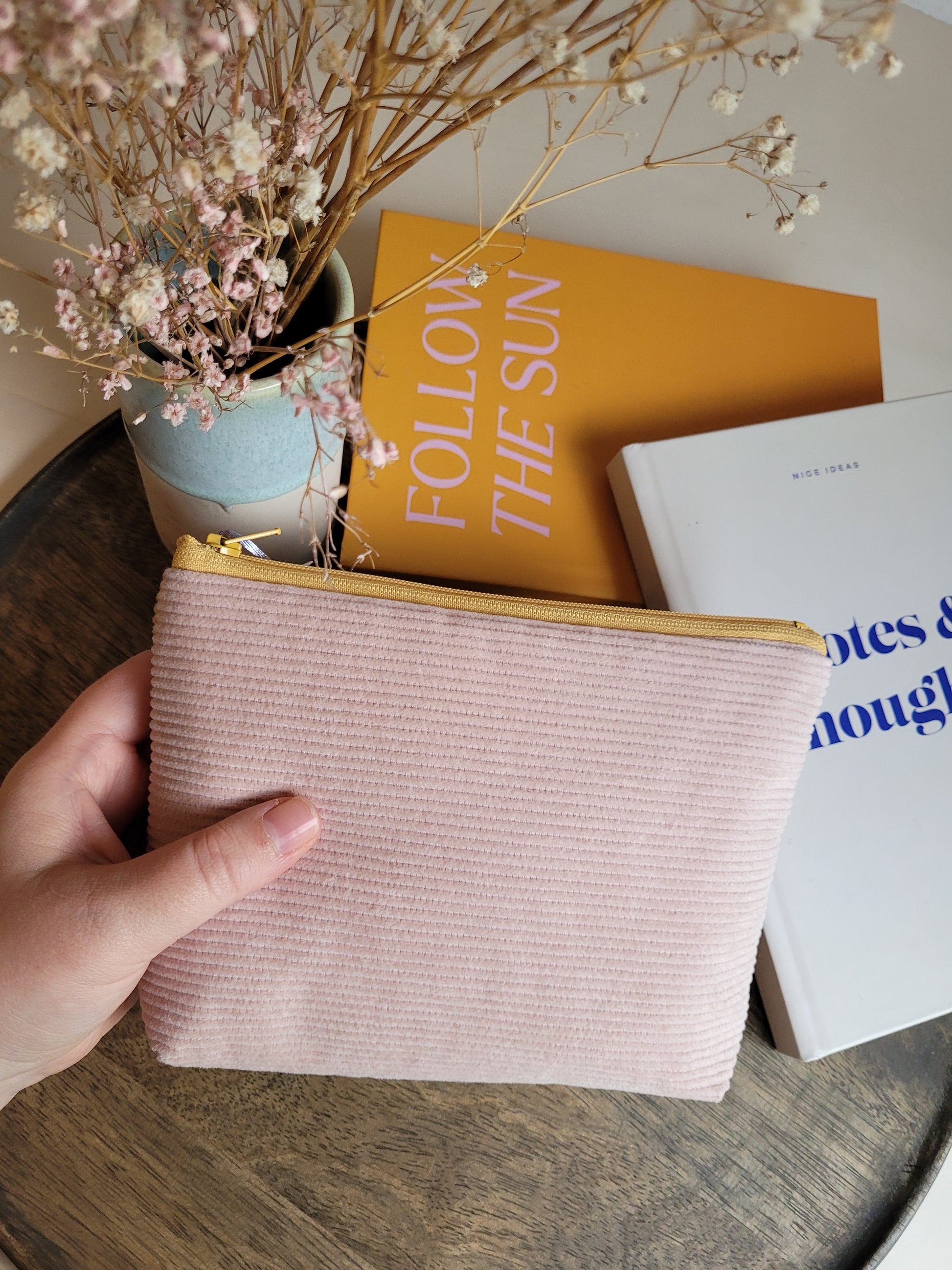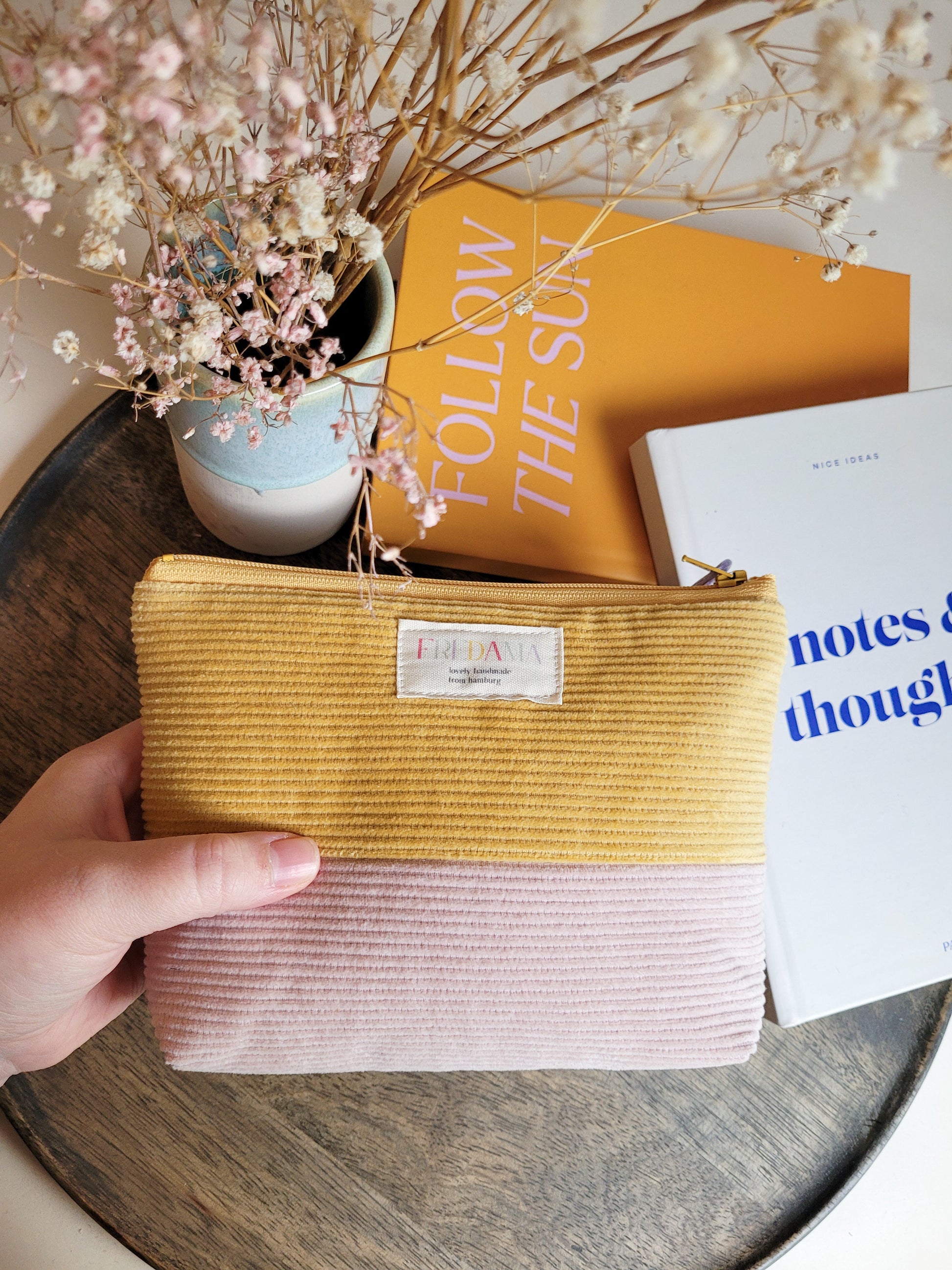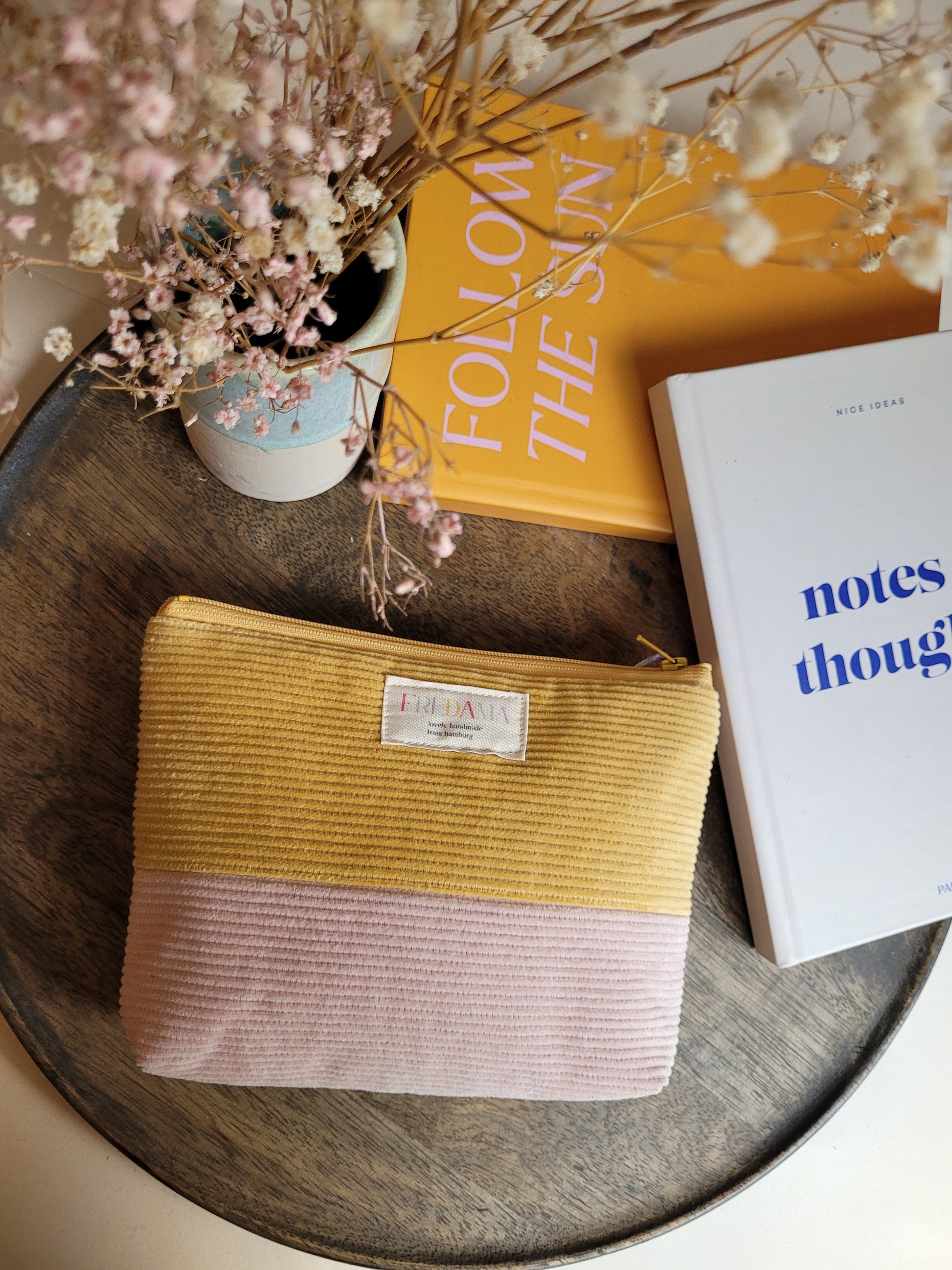 Große Cord Kosmetiktasche mit Zipper, Rosa und Gelb, 20x13x4 cm