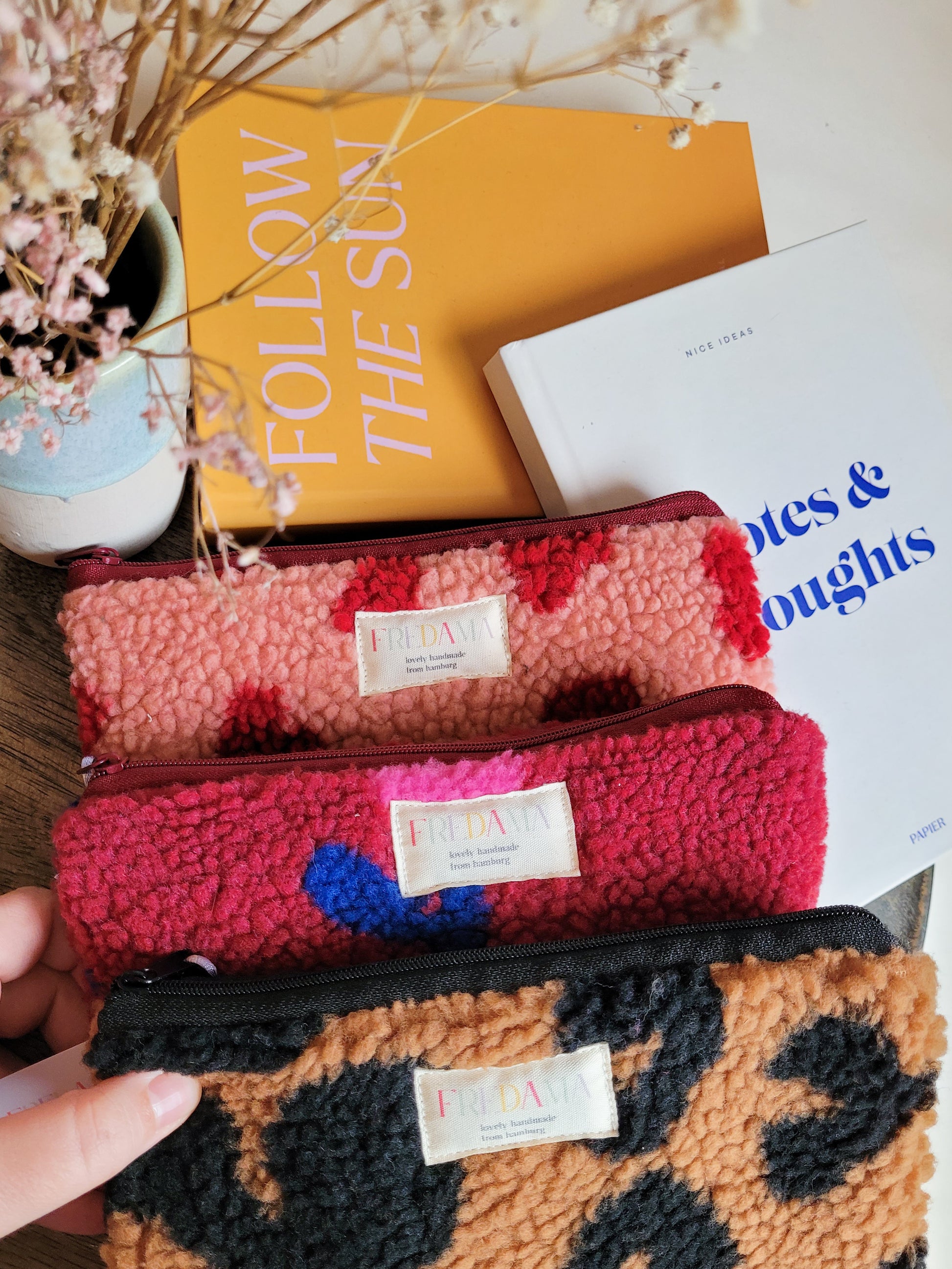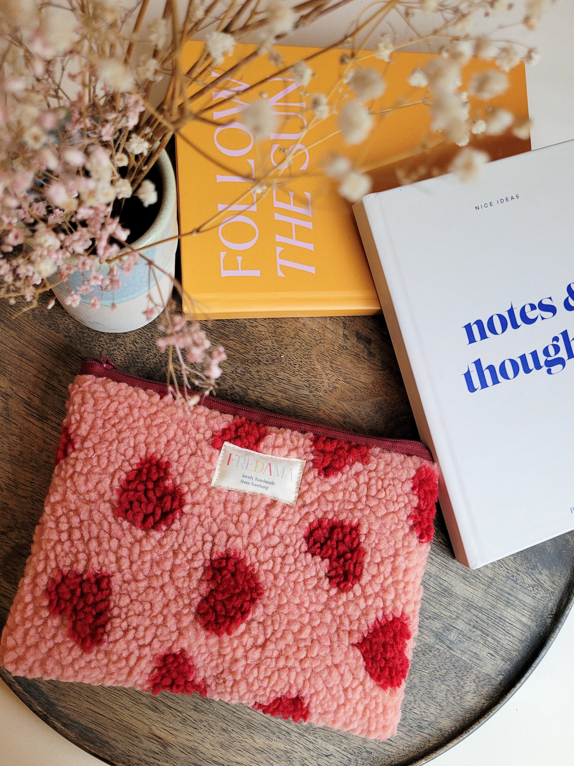 Entdecken Sie unsere handgefertigten Teddy Taschen in einem Altrosa mit roten Herzen und einem roten Reißverschluss – der perfekte Begleiter für Ihre Kosmetikartikel, persönlichen Papiere oder Medikamente. Gefertigt aus hochwertigem und weichem Teddyfell-Stoff, besticht dieses Täschchen durch seine strapazierfähige Beschaffenheit und einer angenehmen Farbe, die Ihrem Alltag einen frischen Akzent verleiht.