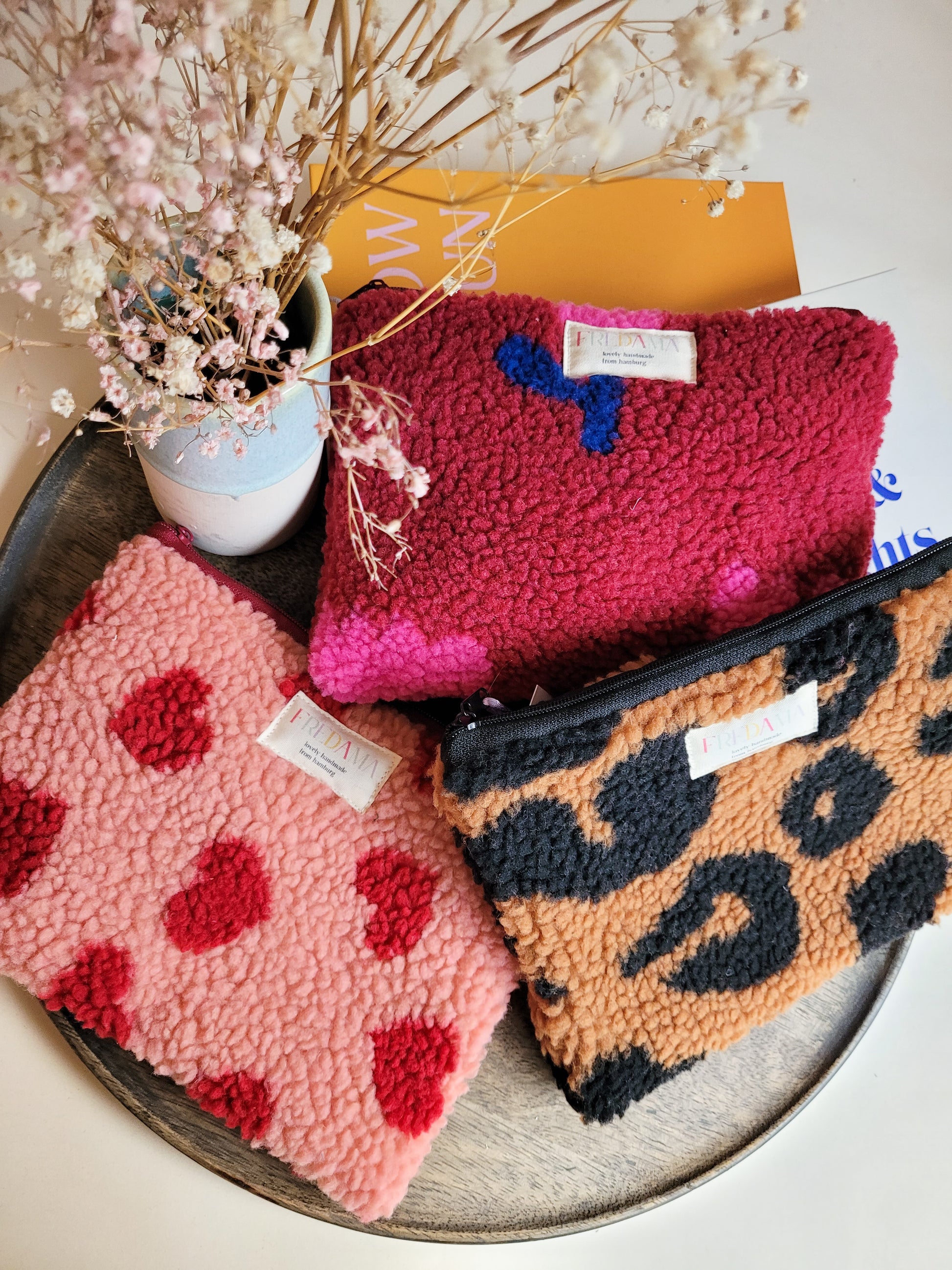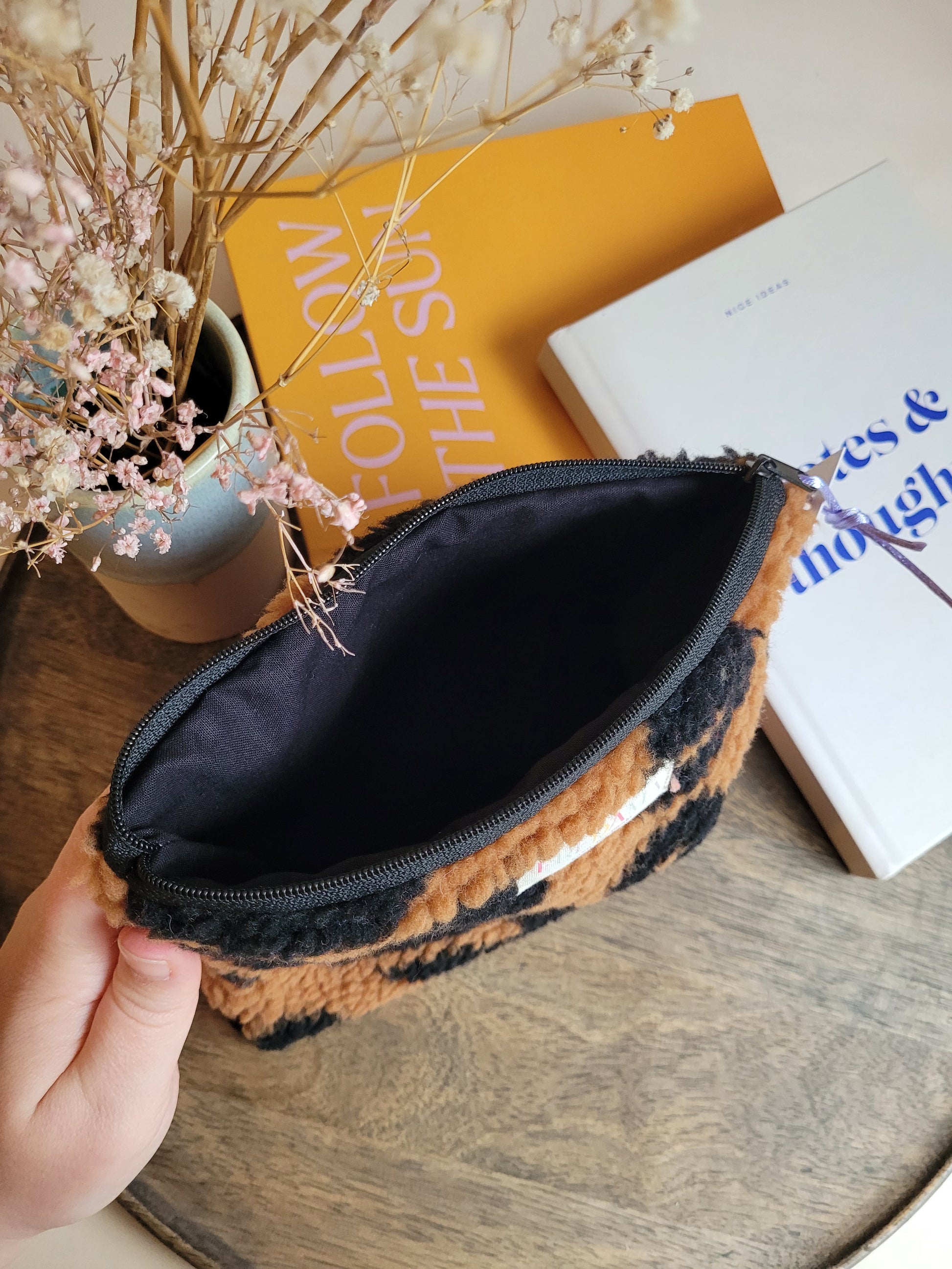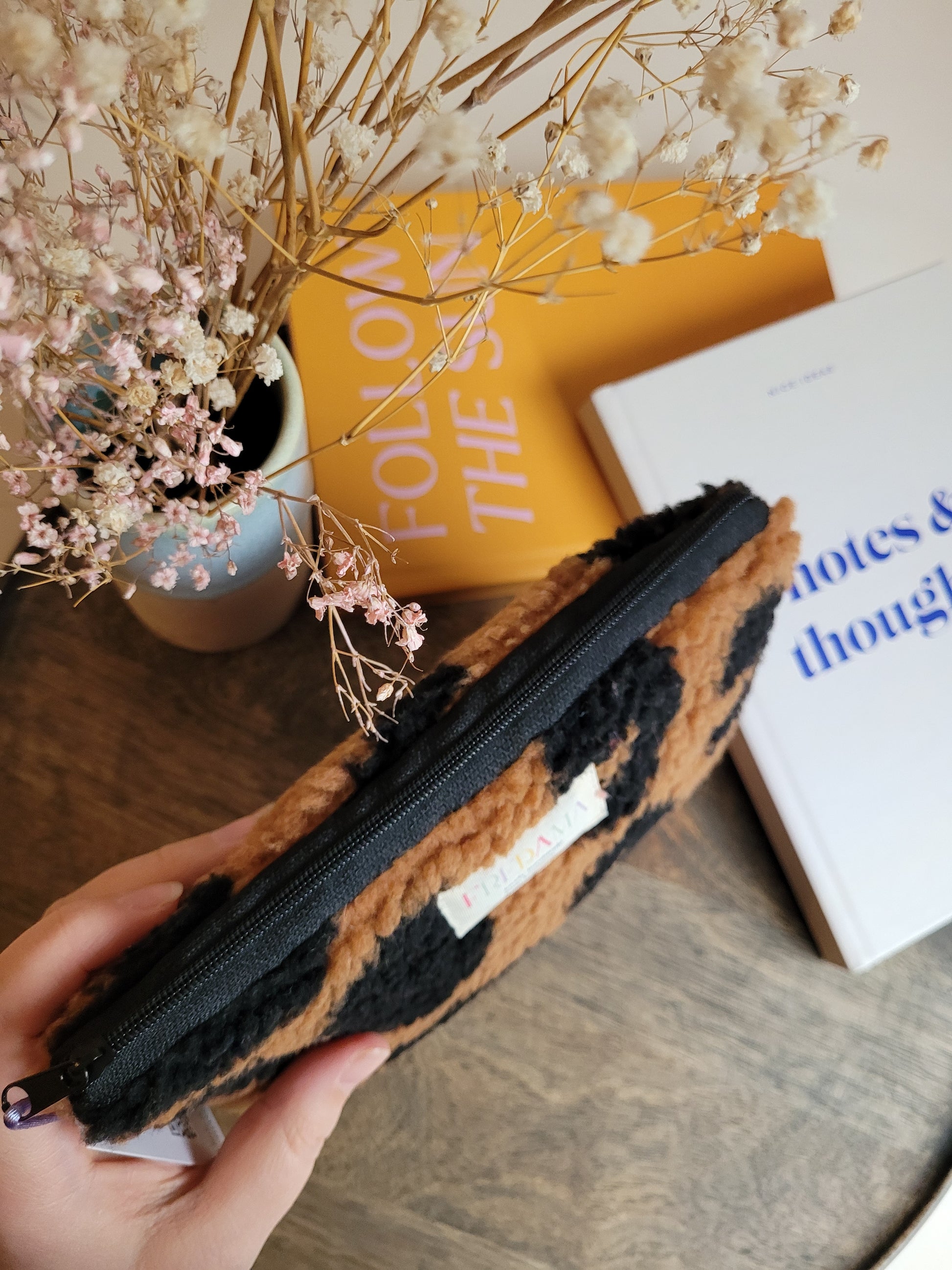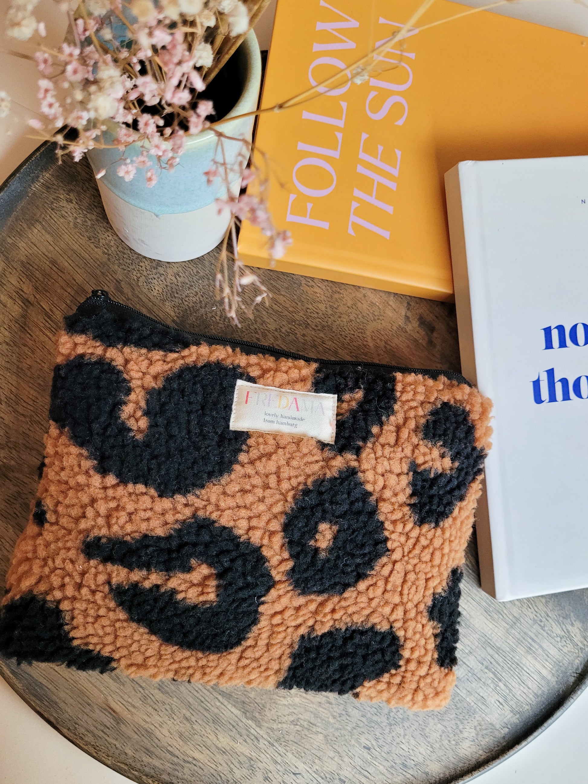Entdecken Sie unsere handgefertigten Teddy Taschen mit einem Braun/Schwarzen Leo-Print und schwarzen Reißverschluss – der perfekte Begleiter für Ihre Kosmetikartikel, persönlichen Papiere oder Medikamente. Gefertigt aus hochwertigem und weichem Teddyfell-Stoff, besticht dieses Täschchen durch seine strapazierfähige Beschaffenheit und einer angenehmen Farbe, die Ihrem Alltag einen frischen Akzent verleiht.