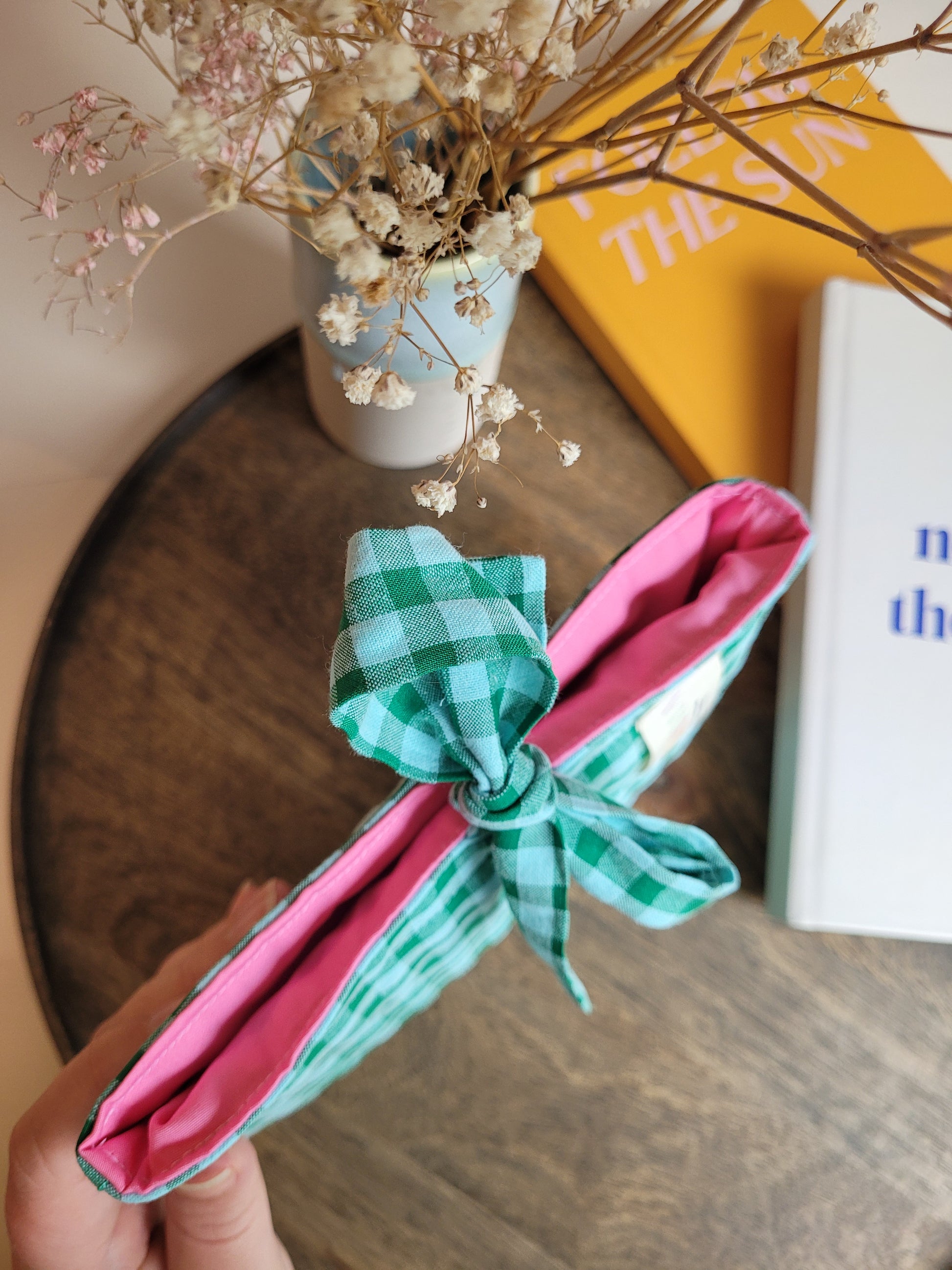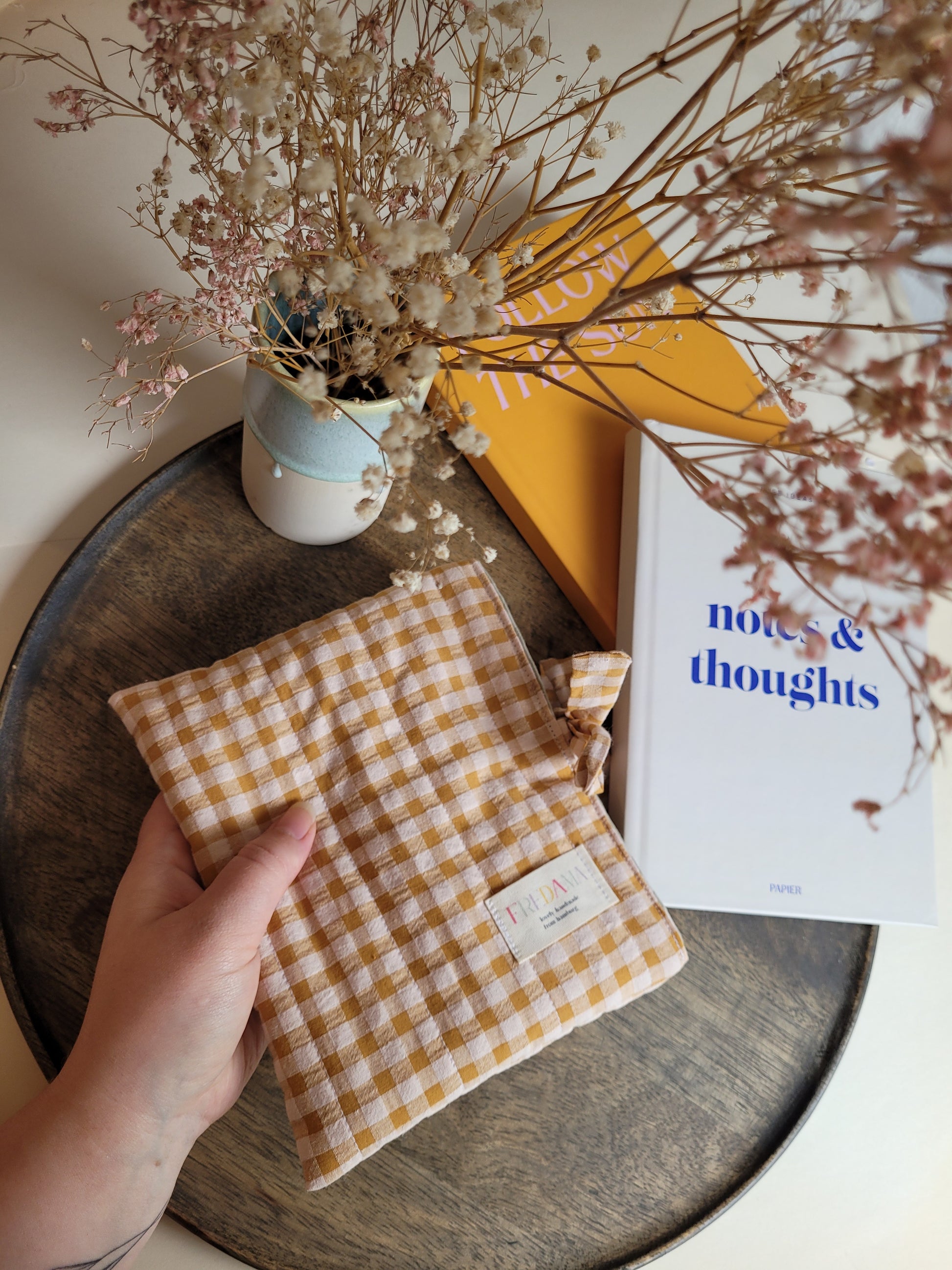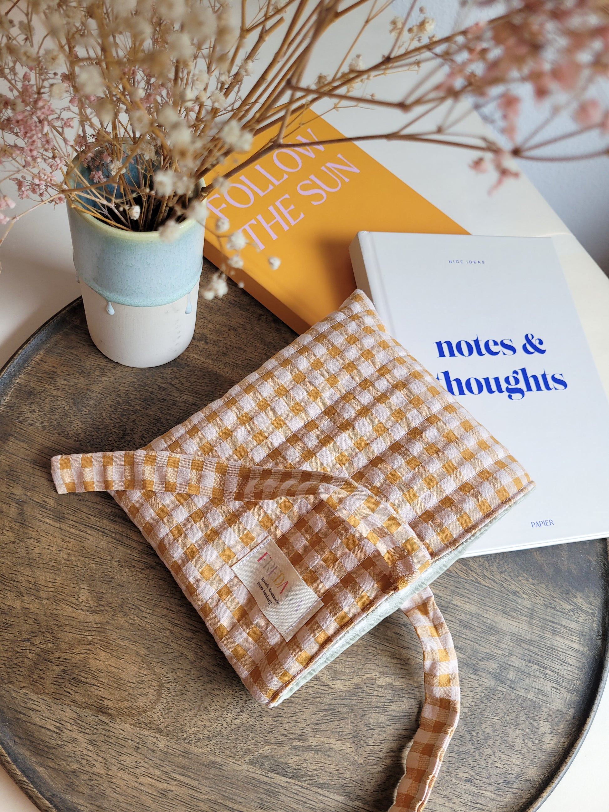 E-Reader Tasche beige/ocker kariert mit Schleife zum Schließen
