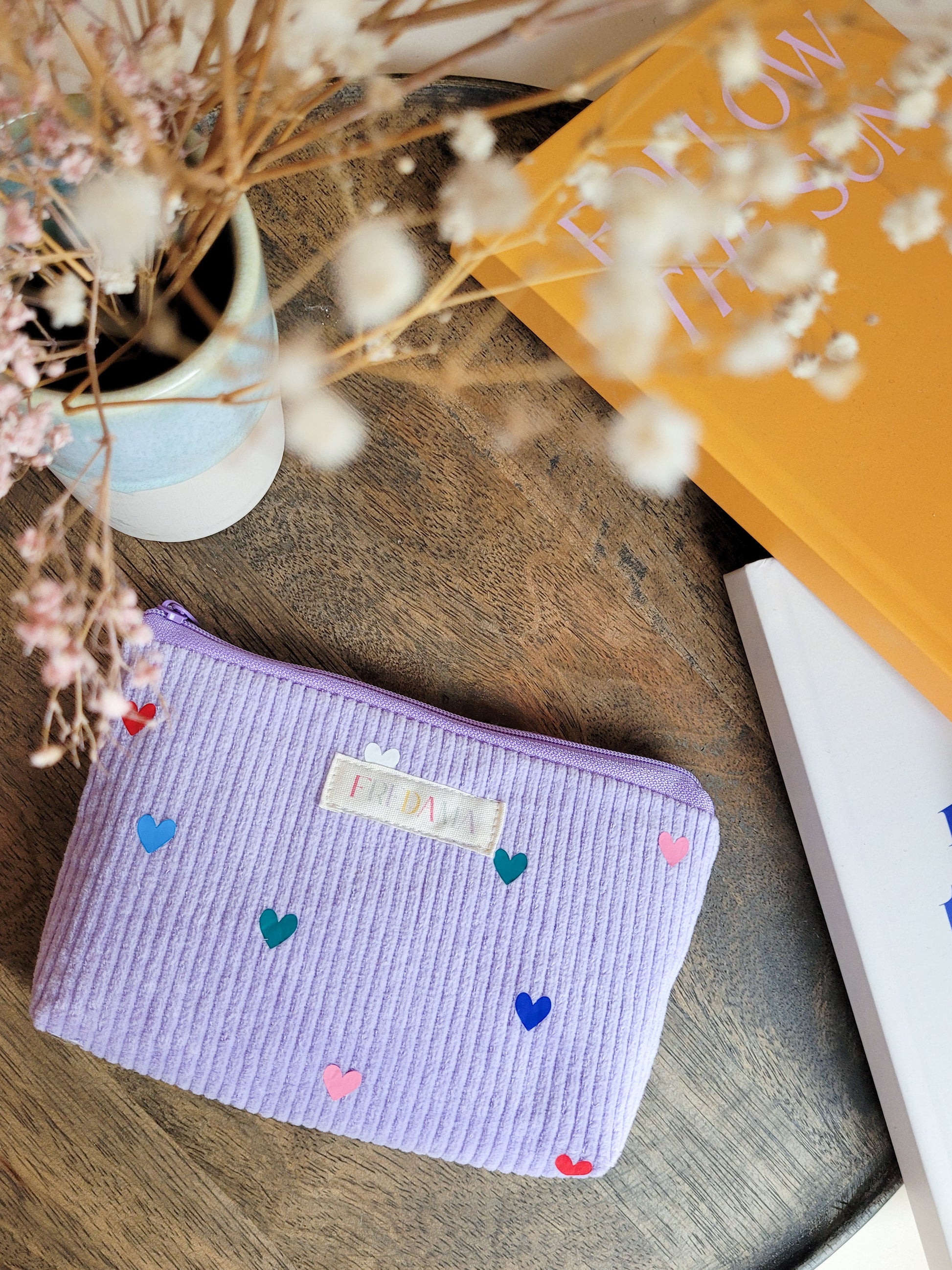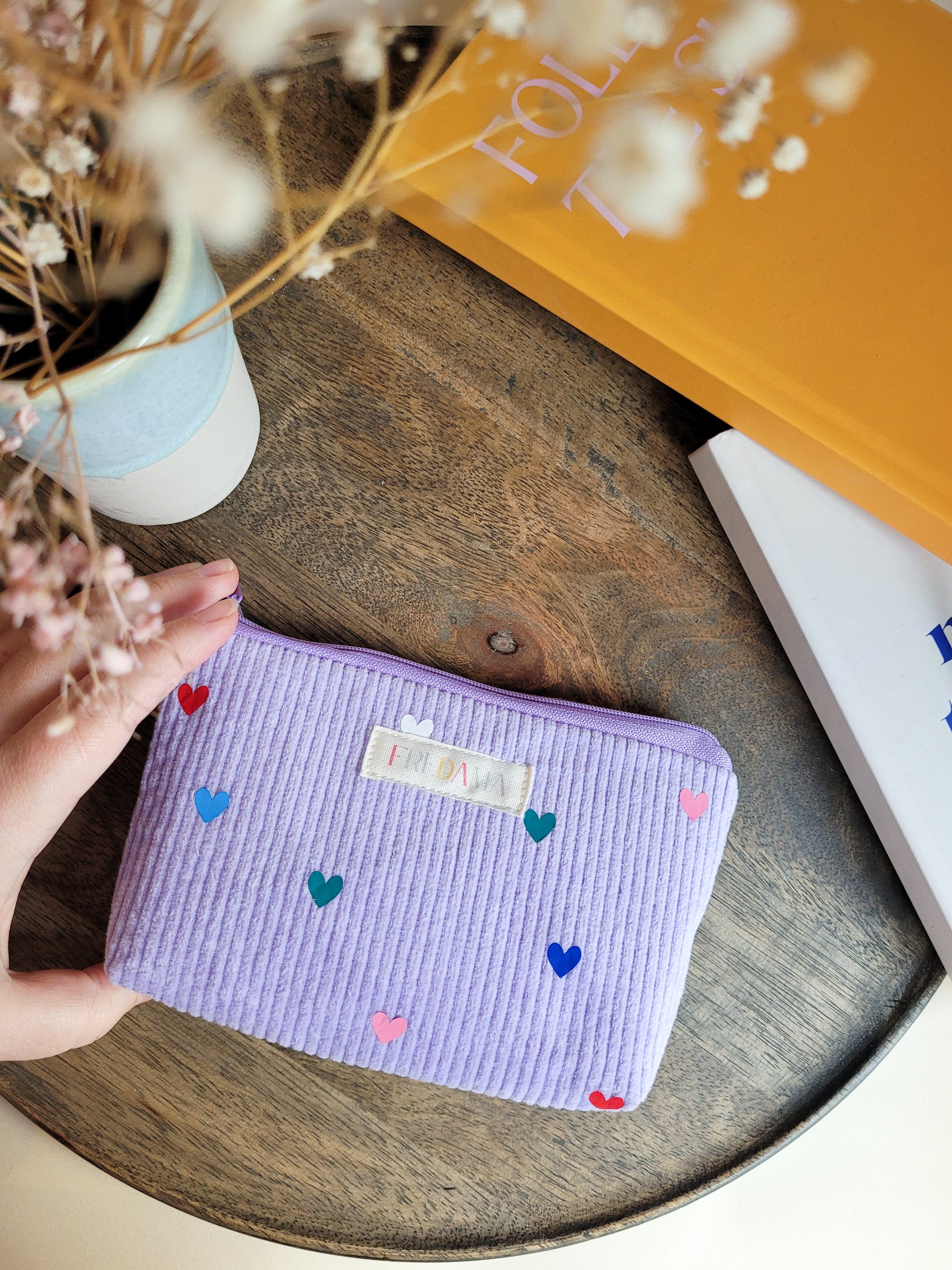Lila Cord-Kosmetiktasche mit bunten Herzen, 17x11x4 cm