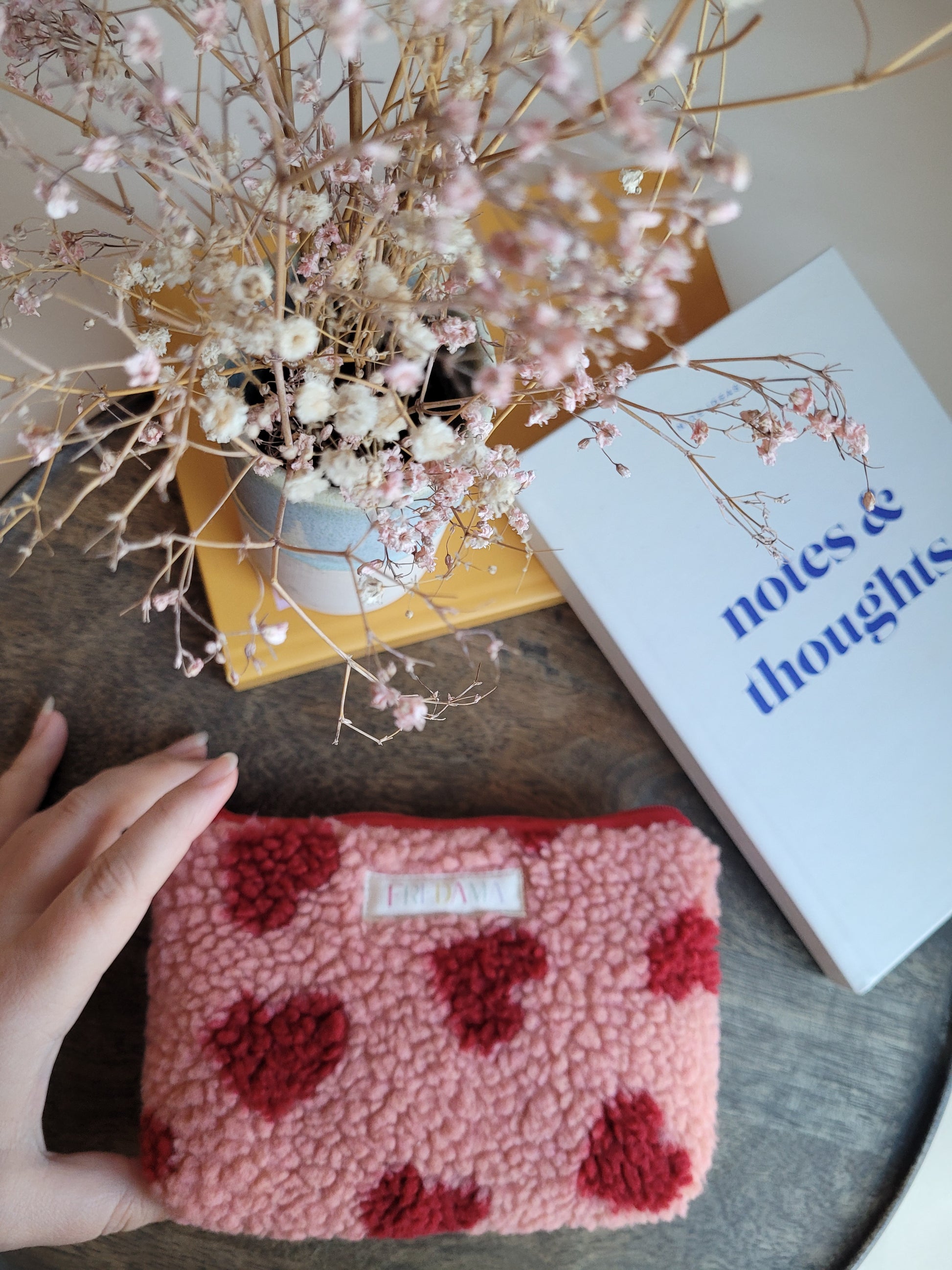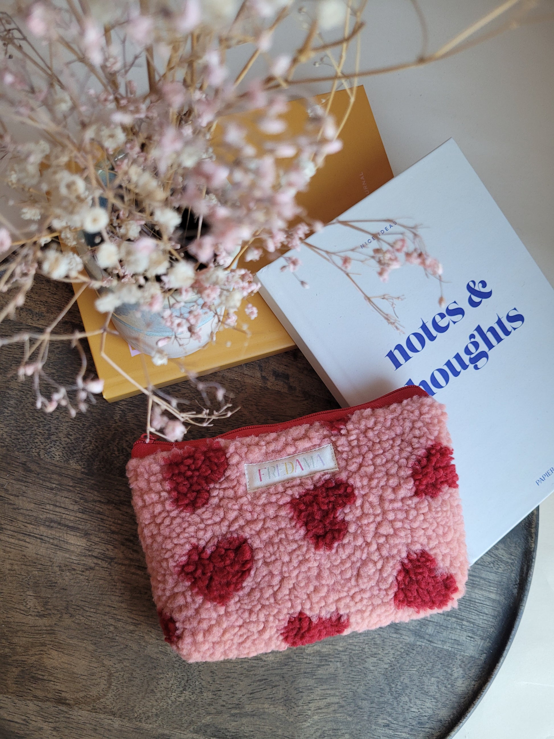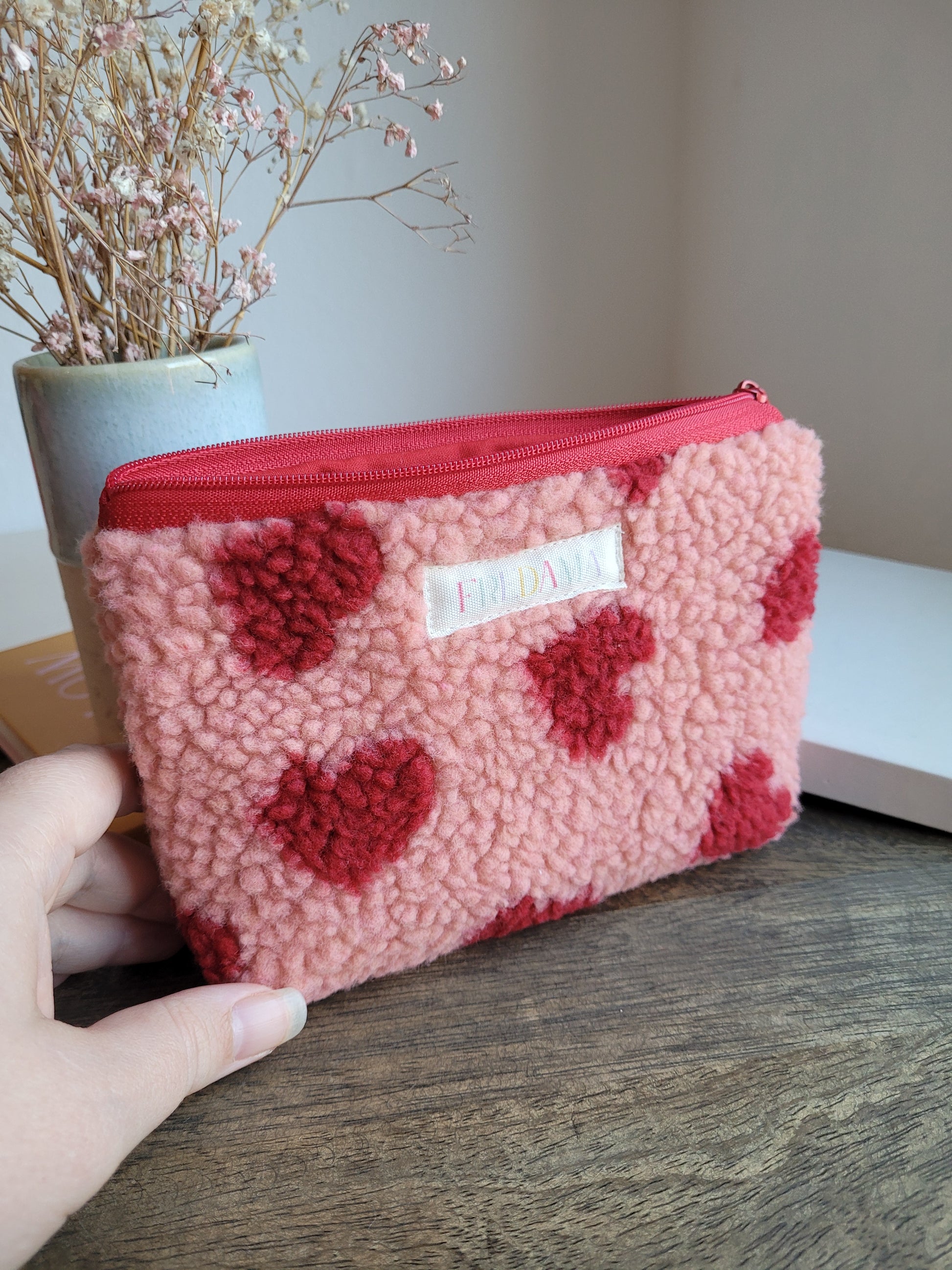 Entdecken Sie unsere handgefertigten Teddy Taschen in einem Altrosa mit roten Herzen und einem roten Reißverschluss – der perfekte Begleiter für Ihre Kosmetikartikel, persönlichen Papiere oder Medikamente. Gefertigt aus hochwertigem und weichem Teddyfell-Stoff, besticht dieses Täschchen durch seine strapazierfähige Beschaffenheit und einer angenehmen Farbe, die Ihrem Alltag einen frischen Akzent verleiht.
