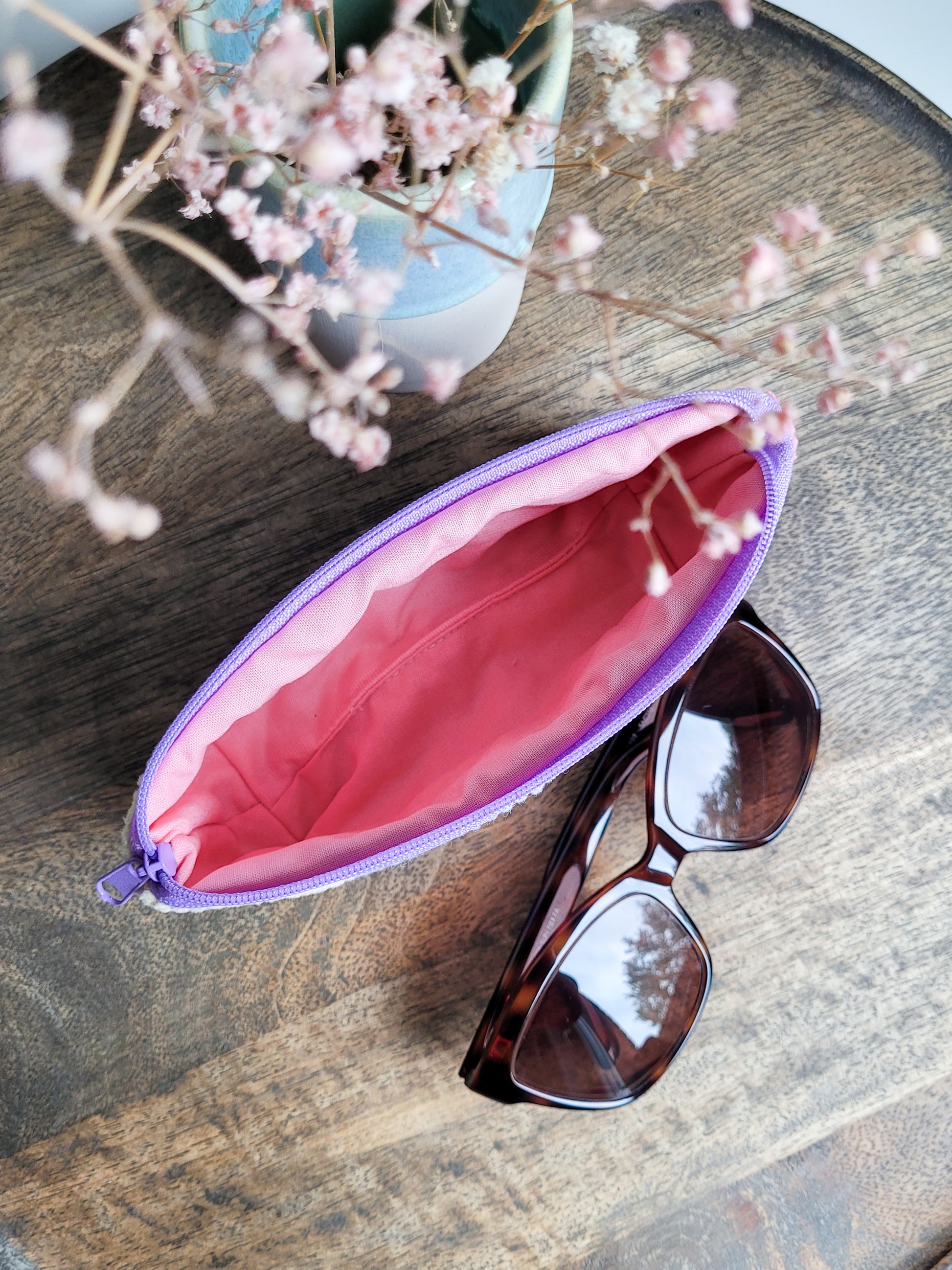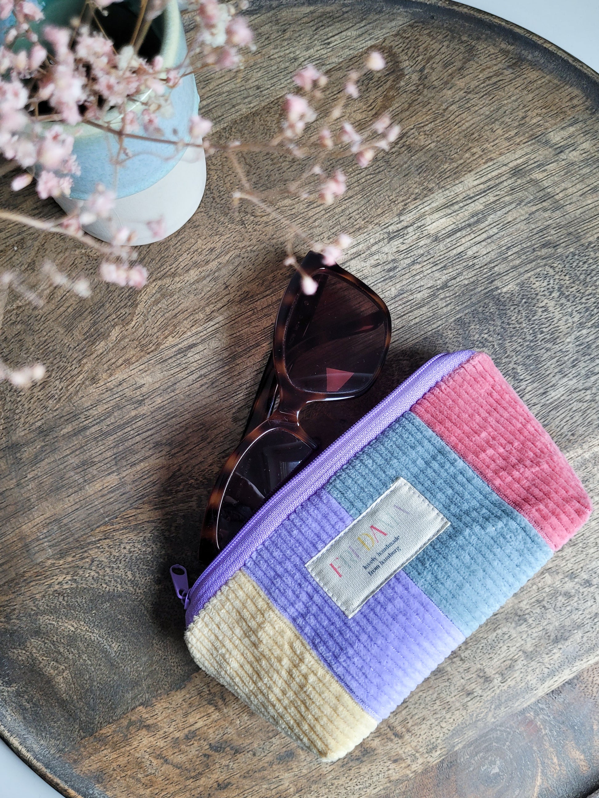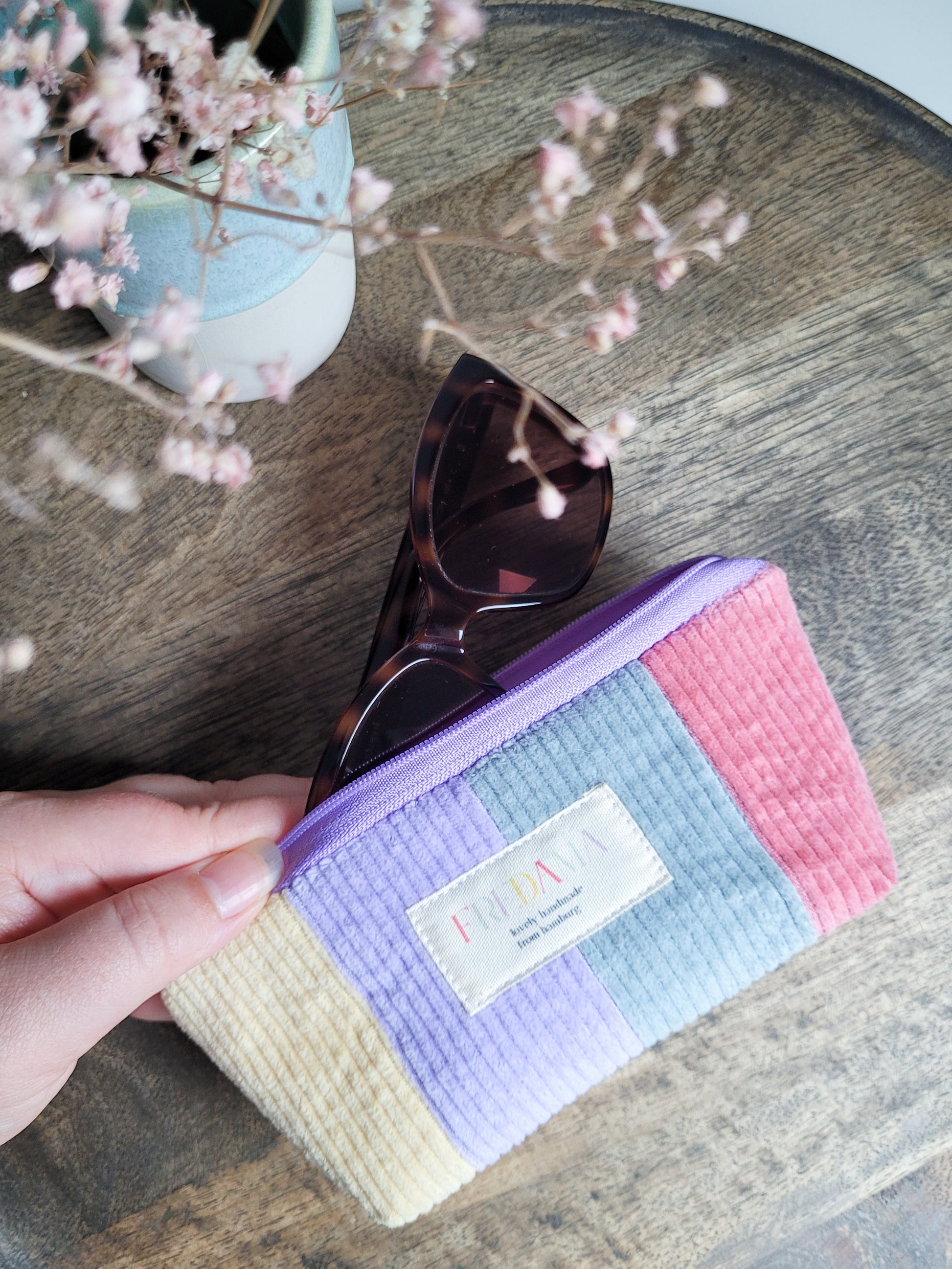 Zum Schutz deiner Brille dient dieses bunte retro Etui mit einem Zipperverschluss in der Farbkombination, Gelb, Pink, Mint und Lila. Tagesbrillen, Sonnenbrillen als auch Lesebrillen passen perfekt rein und sind durch den Cordstoff und das Volumenvlies sehr gut geschützt.