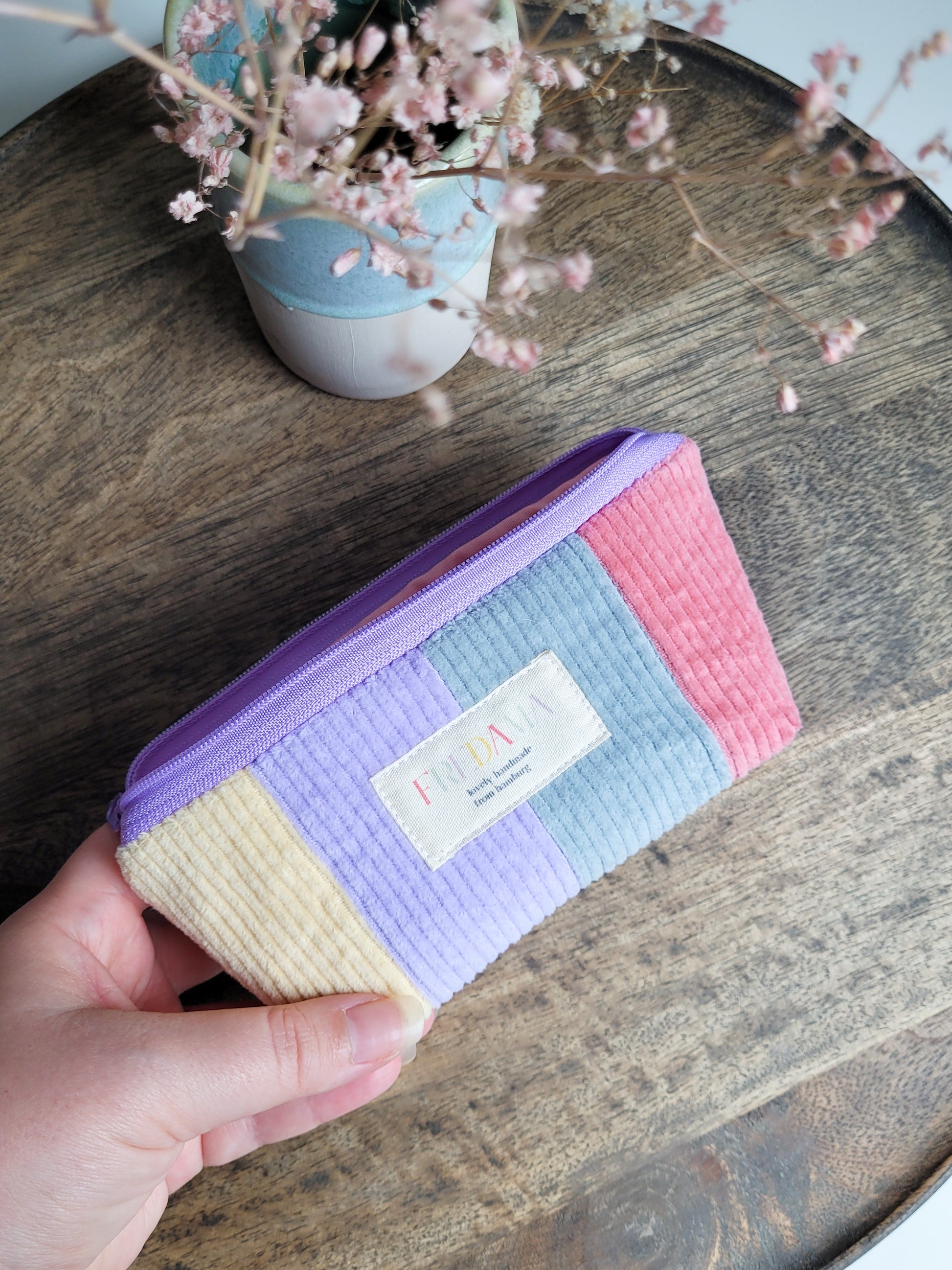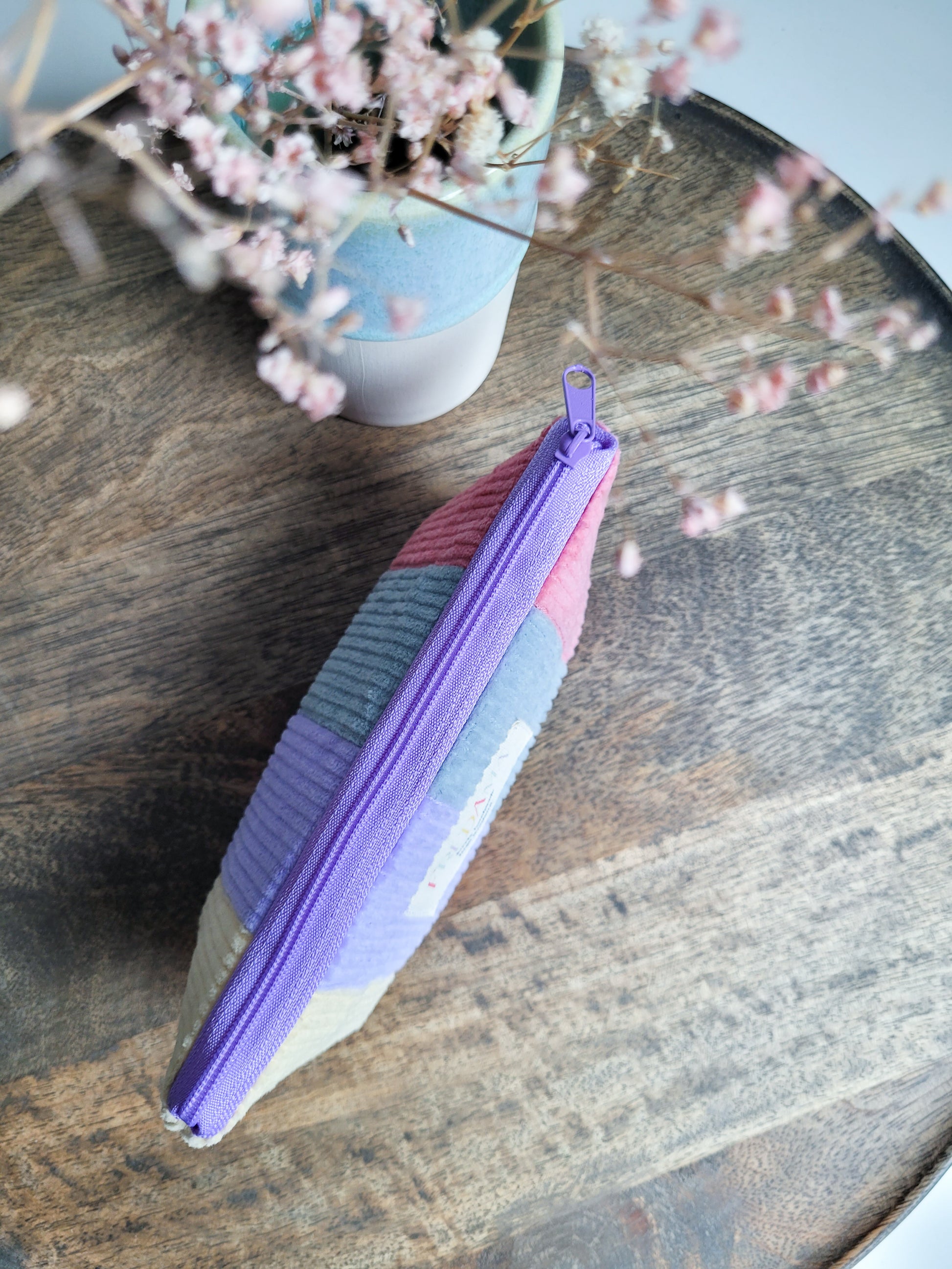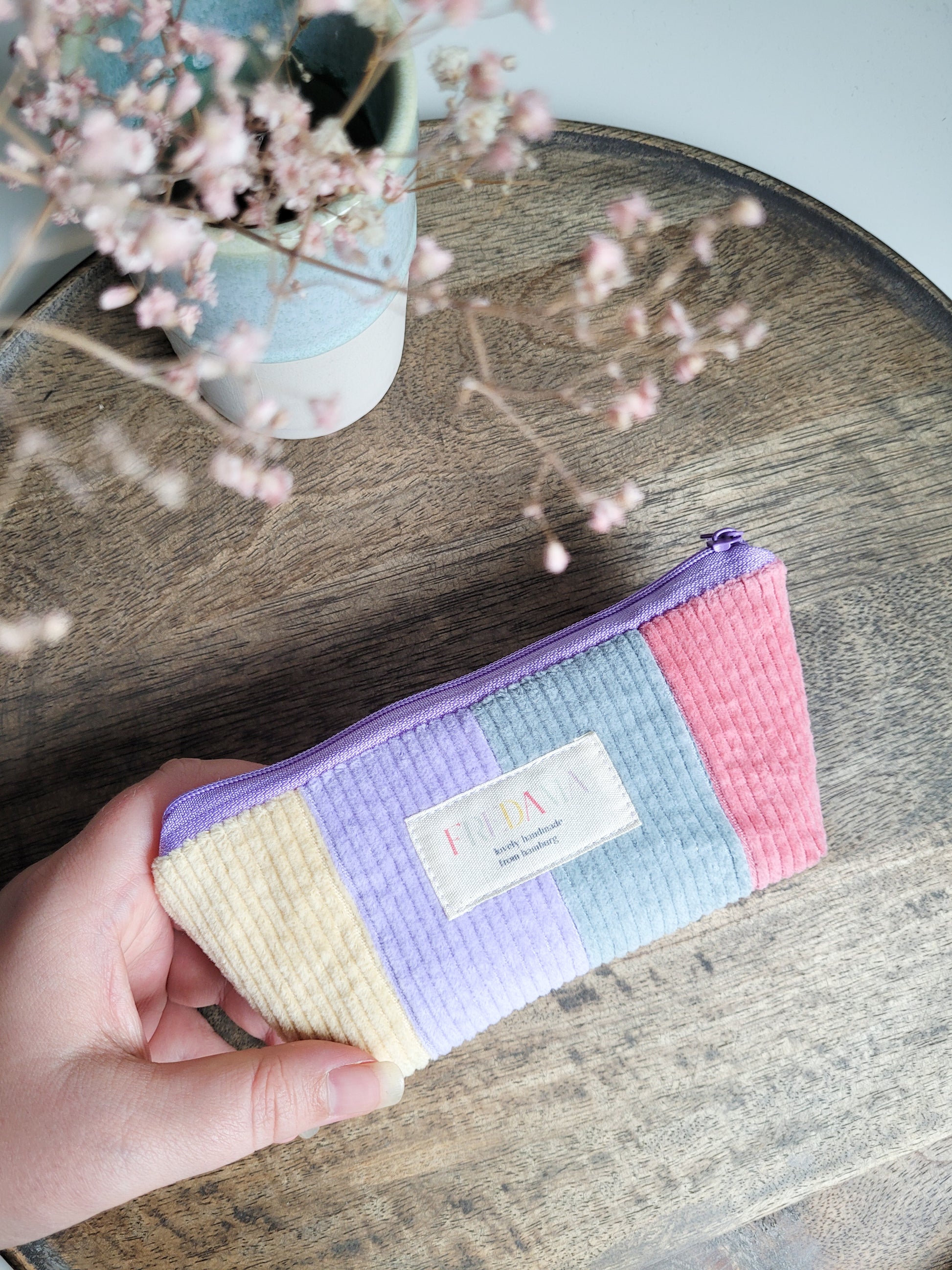 Cordstoff aus 97% Baumwolle und 3% Elasthan (Gewicht von 325g/m2), innen ist auch Baumwollstoff, sowie Volumenvlies vernäht. Ca. 19 cm 3mm Zipper.