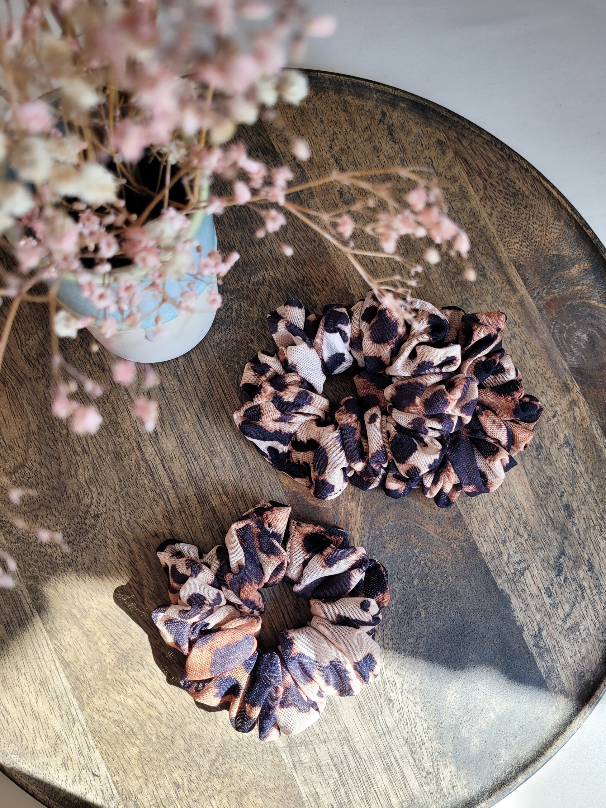 Scrunchies sind trendige und praktische Haar-Accessoires, welche bei niemandem mehr fehlen sollten. Diese Haargummis aus weichem Tüll sind sehr angenehm und schonend für Deine Haare, sowie sehr elegant. Der Leo-Print ist ein absoluter Hingucker und vielseitig zu kombinieren.