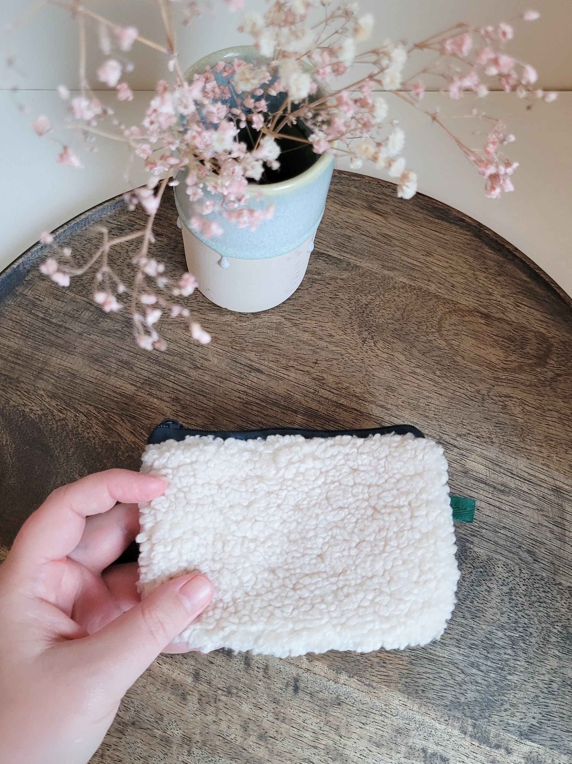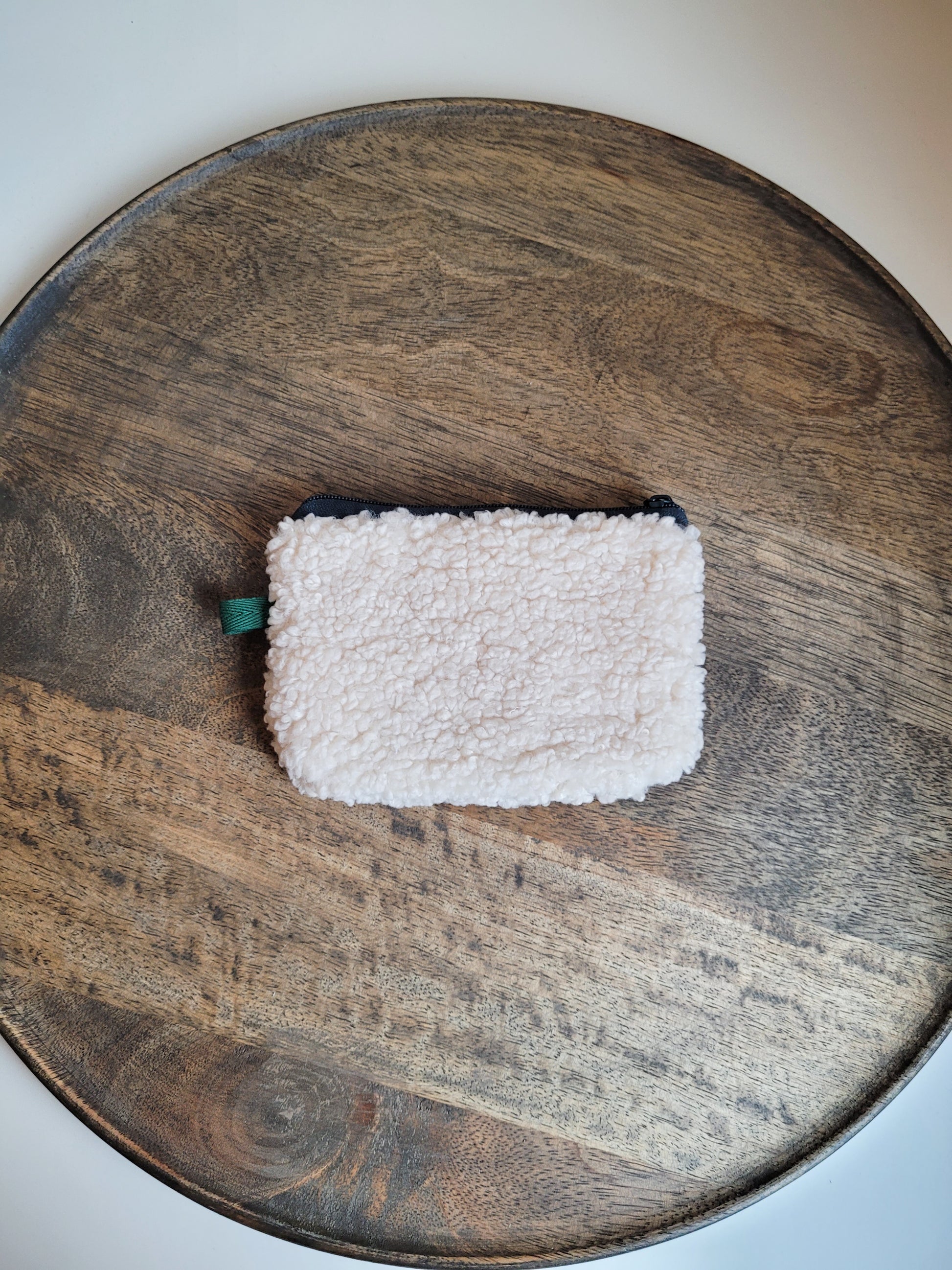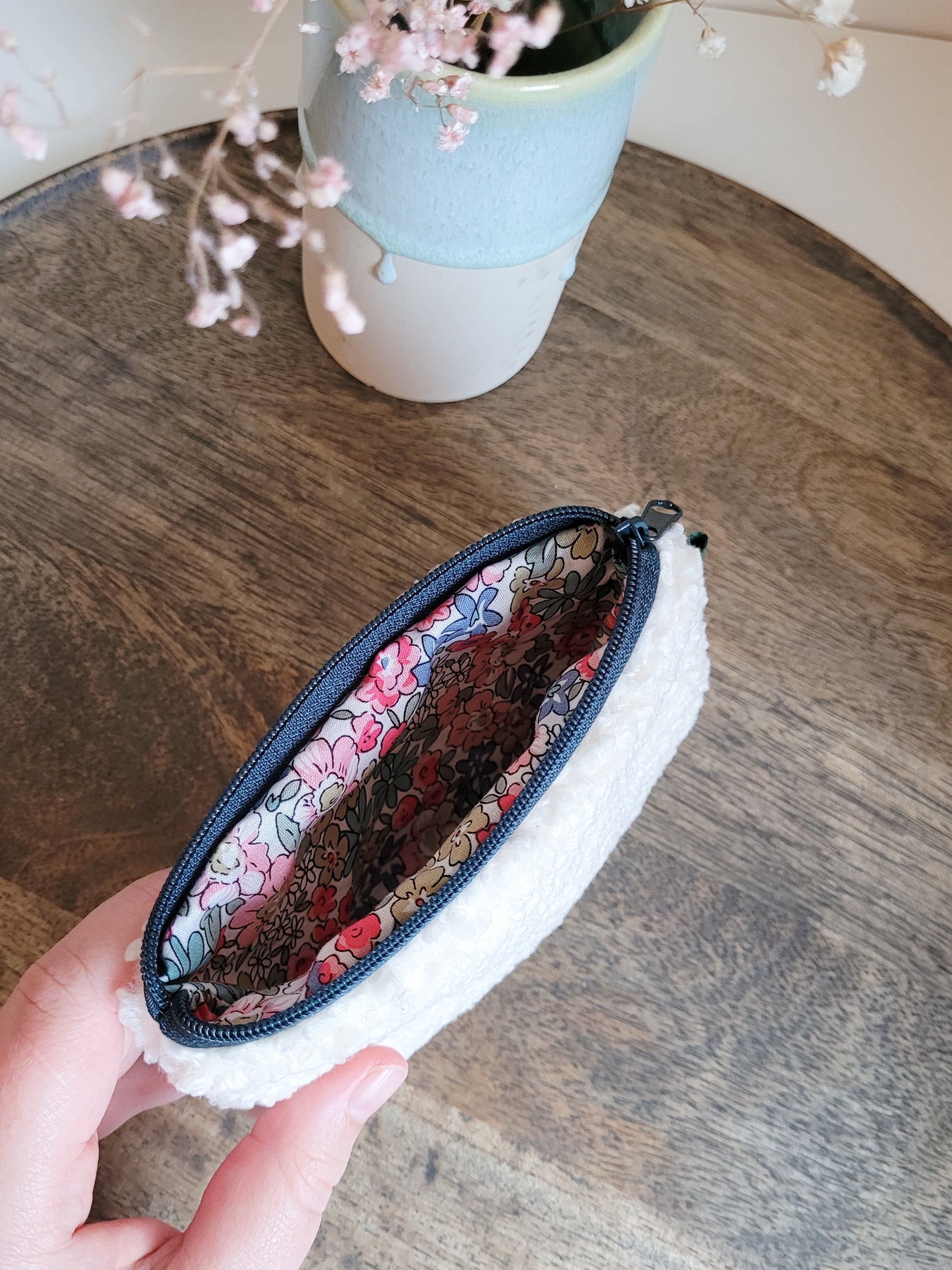 Dieses kleine Täschchen ist in einem kuscheligen Teddy-Stoff in einem Weiß gestaltet. Der Zipper ist Dunkelgrün und der Innenstoff mit einem bunten Blumenmuster. Zusätzlich ist außen eine farblich passende Lasche. Das Täschchen kann als Geldbörse, Kosmetiktasche, Tampontasche oder für Reisen perfekt genutzt werden.
